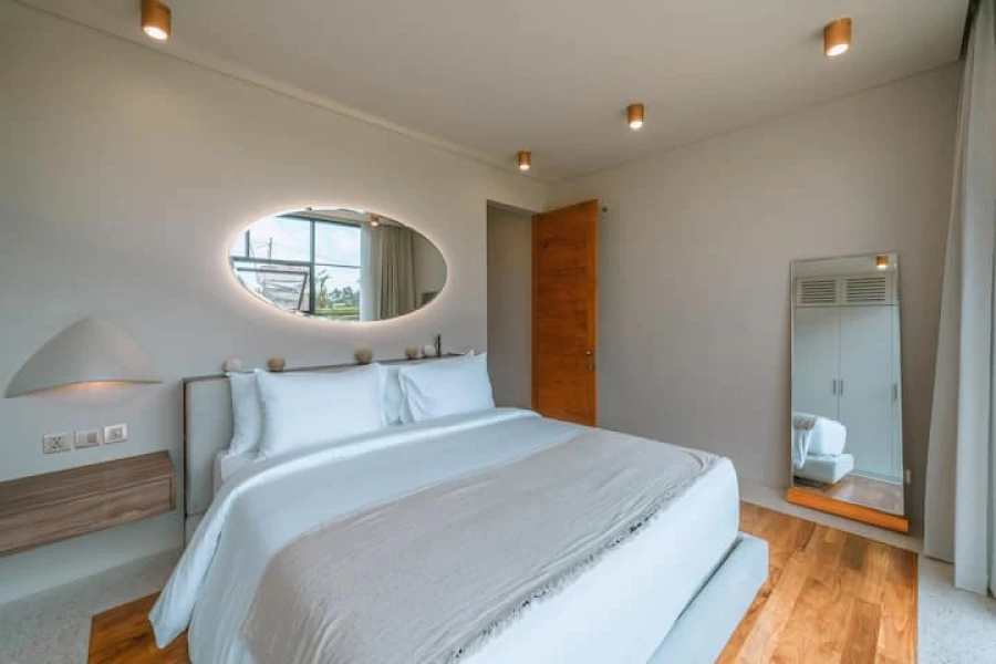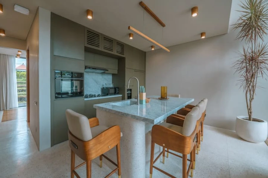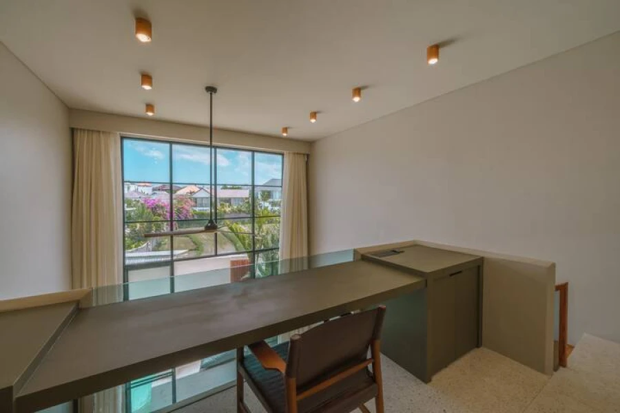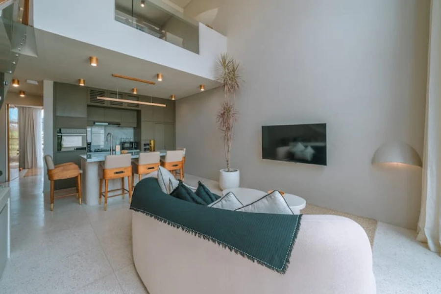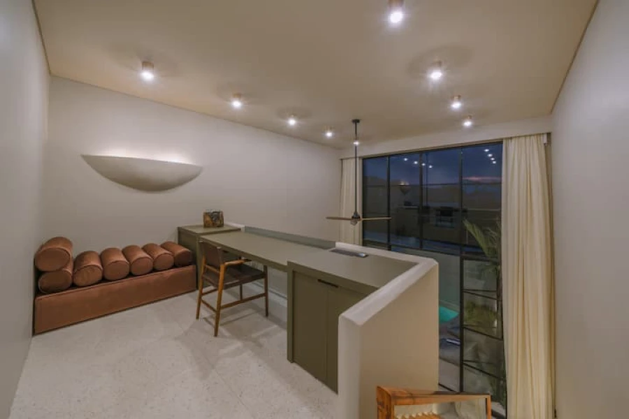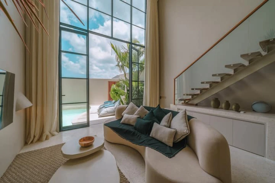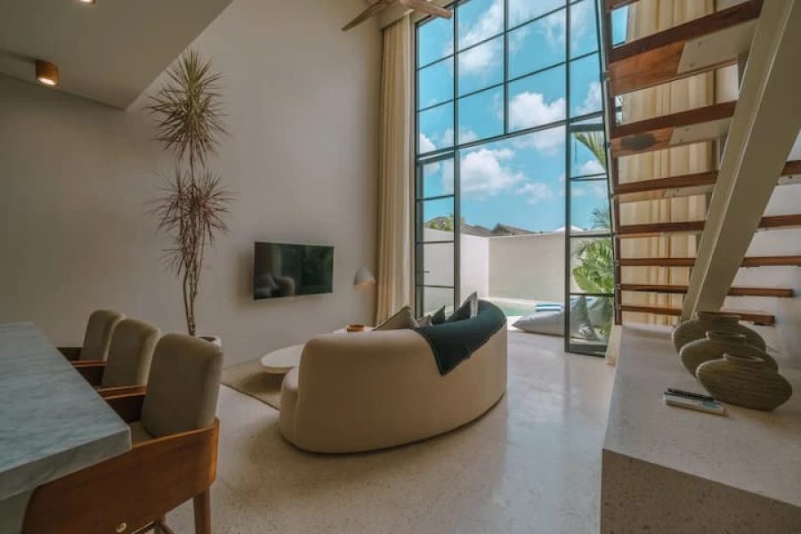 Canggu'nun kalbinde mükemmel bir konumda yer alan şık 2 yatak odalı villamızda modern lüksü deneyimleyin. Bu villa, üst düzey olanaklar, merkezi konum ve minimalist bir tasarım sunmaktadır. Akıllı TV'li geniş bir oturma odasına sahip zarif, açık planlı bir yaşam alanına adım atın. Yemek alanı, yemek hazırlamak veya özel yemek servisinin keyfini çıkarmak için mükemmel olan şık, tam donanımlı bir mutfağa açılmaktadır.