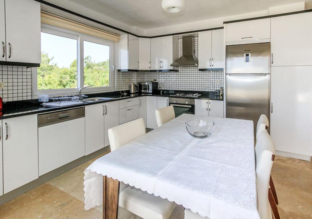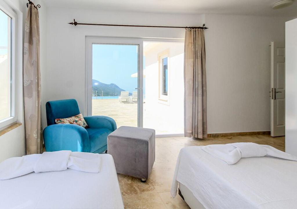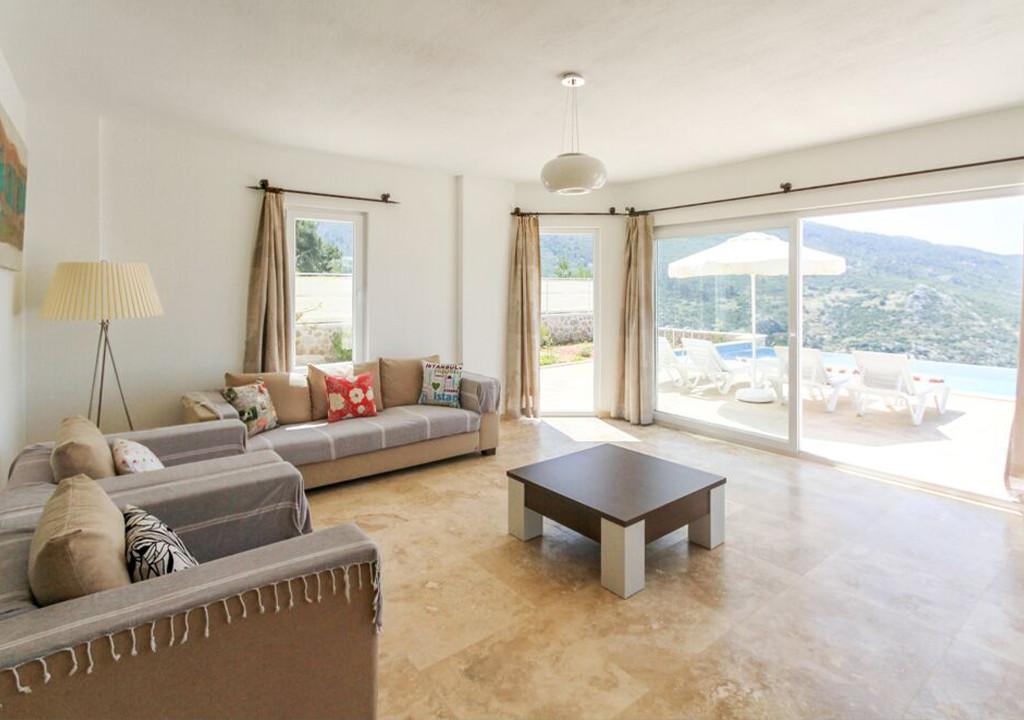 Oturma odası: Havuz manzaralı oturma grubu, Uydu TV (LCD), Klima, 6 kişilik yemek masası, Havuz terasına çıkış.