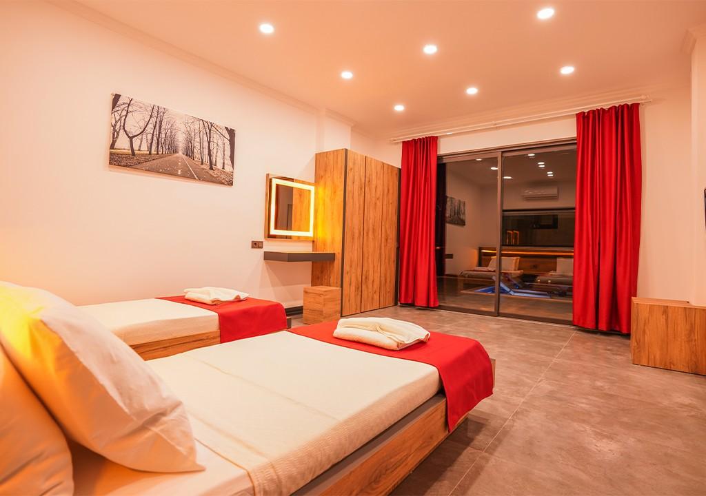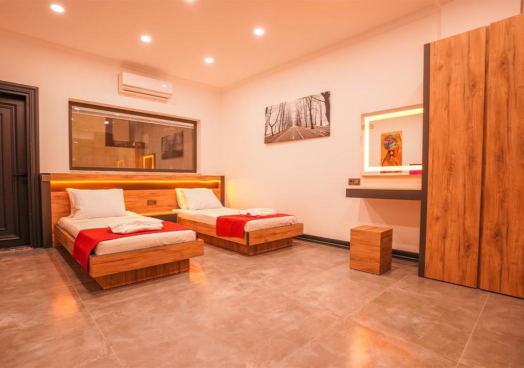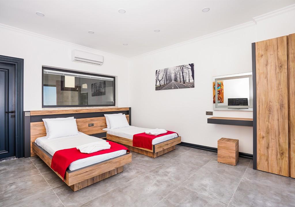 2 tek kişilik yatak, komodin, klima, gardırop ve tuvaletli özel banyo.