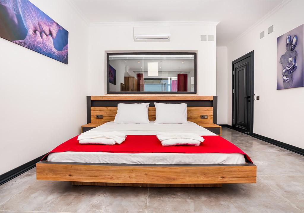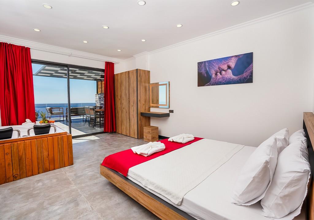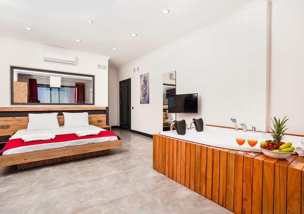 1 adet çift kişilik yatak, gardırop, makyaj masası, jakuzi, televizyon, klima ve tuvaletli özel banyo.
