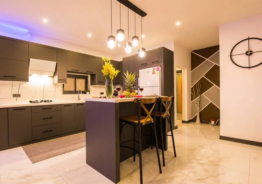 Refrigerator, Dishwasher, Oven with 4 burners (built-in), Microwave oven, Electric kettle, Water dispenser, Dining set for 4 people, Pan, Pots, Cutlery, etc.
