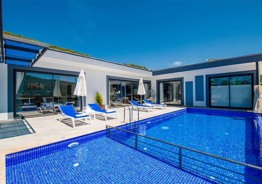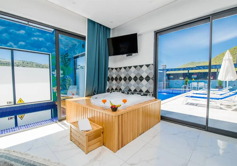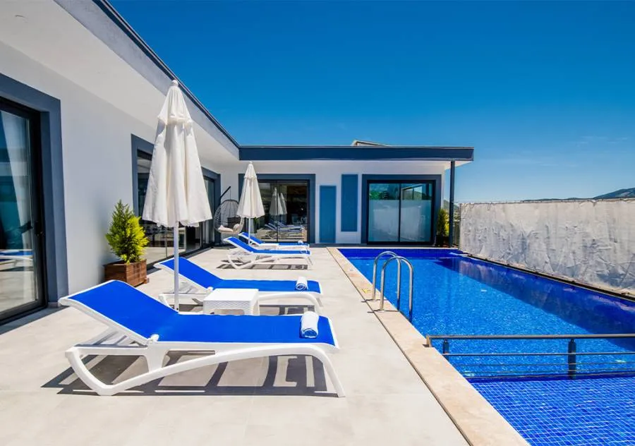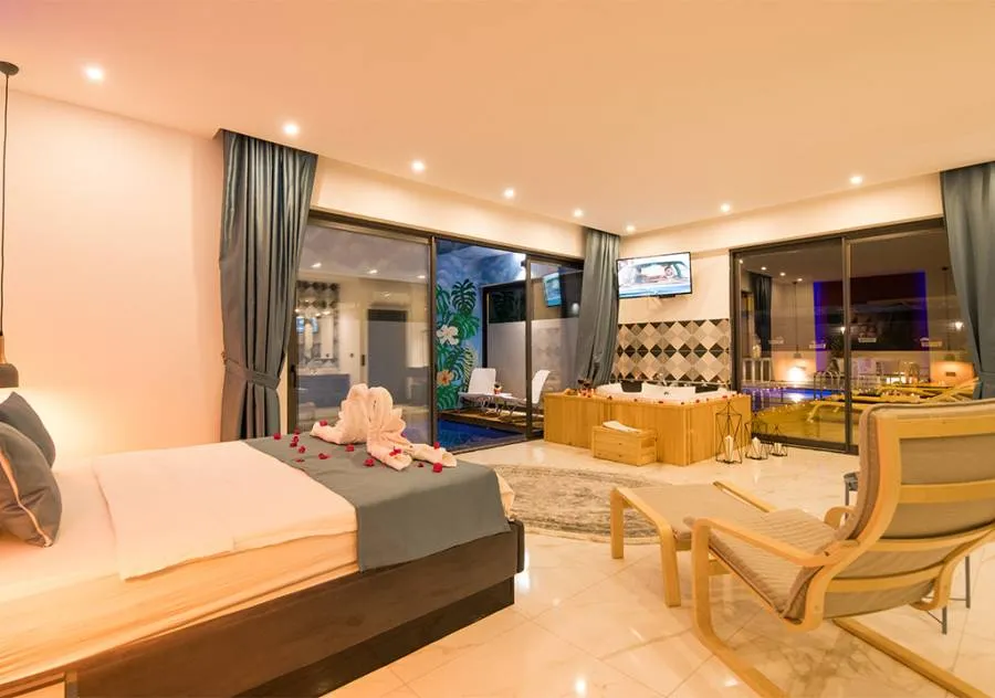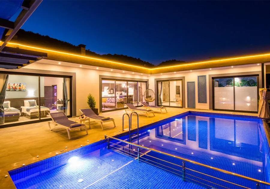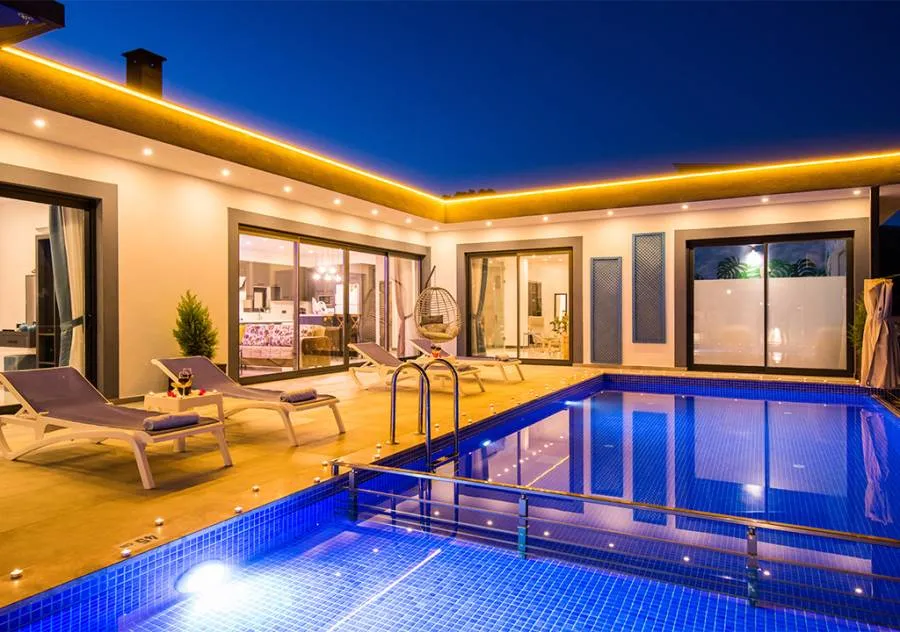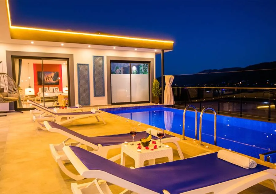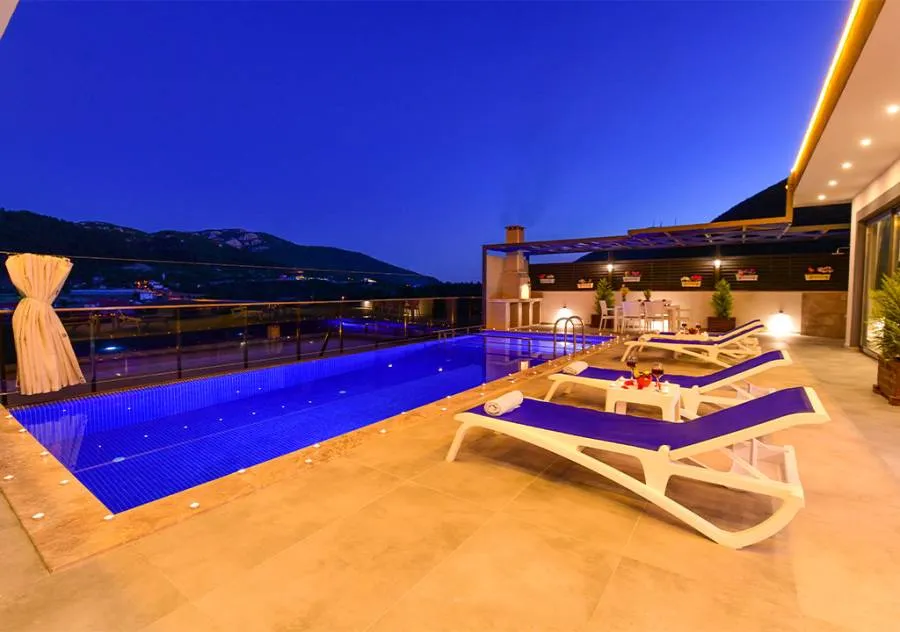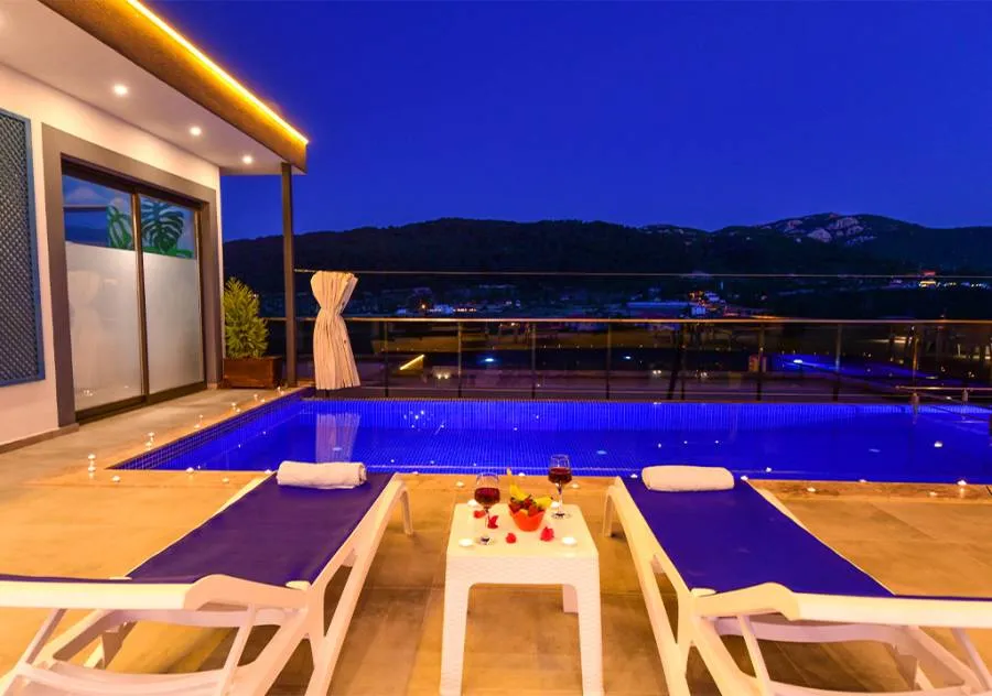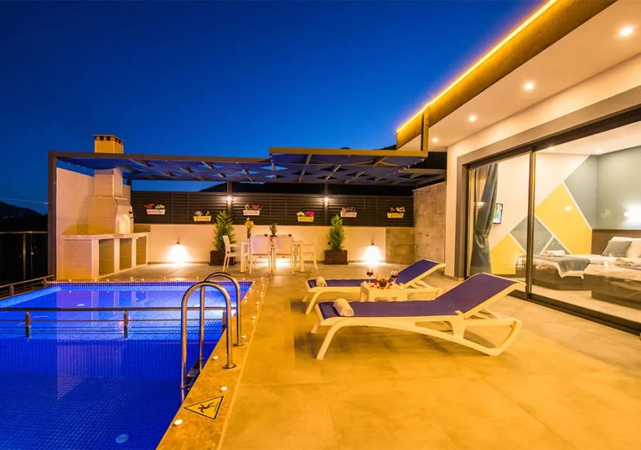 Located in Sarıbelen area of Kalkan, Villa is positioned amidst nature, offering a pool area that is not visible from the outside, making it an ideal choice for small families with its 2 bedrooms. With its indoor heated pool, it promises a delightful holiday for you and your family.