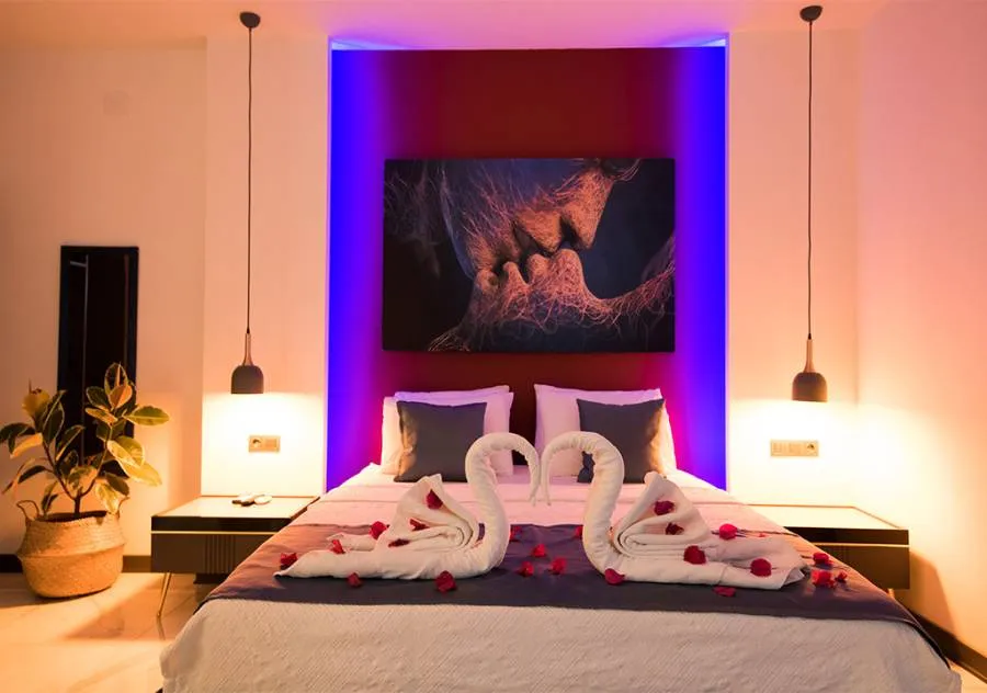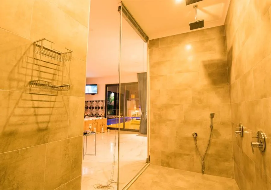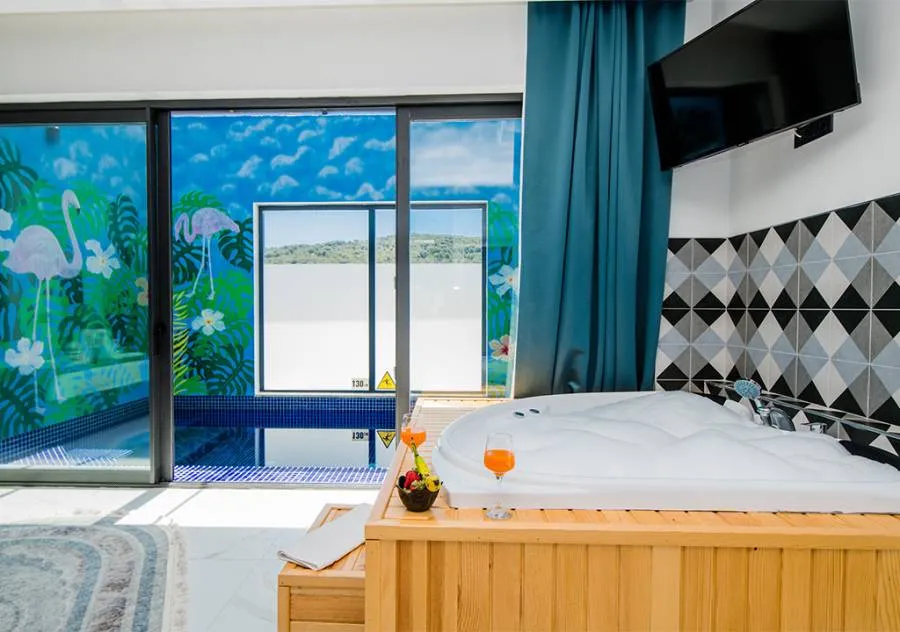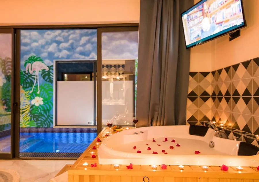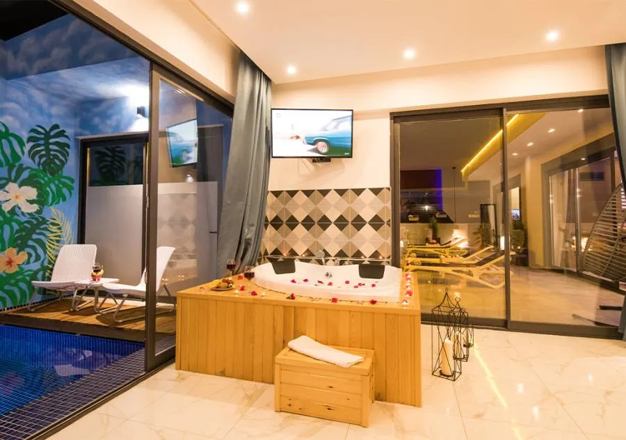 Double bed, air conditioning, jacuzzi, bedside table, wardrobe, bathroom and sink.