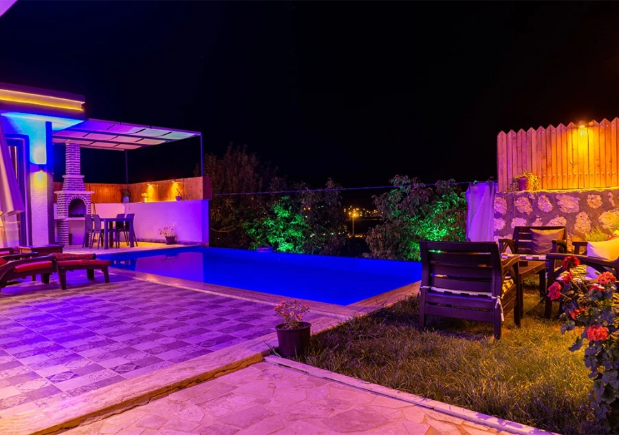 The pool area of the villa, which is not visible from the outside, is specially designed for honeymoon couples and conservative families.