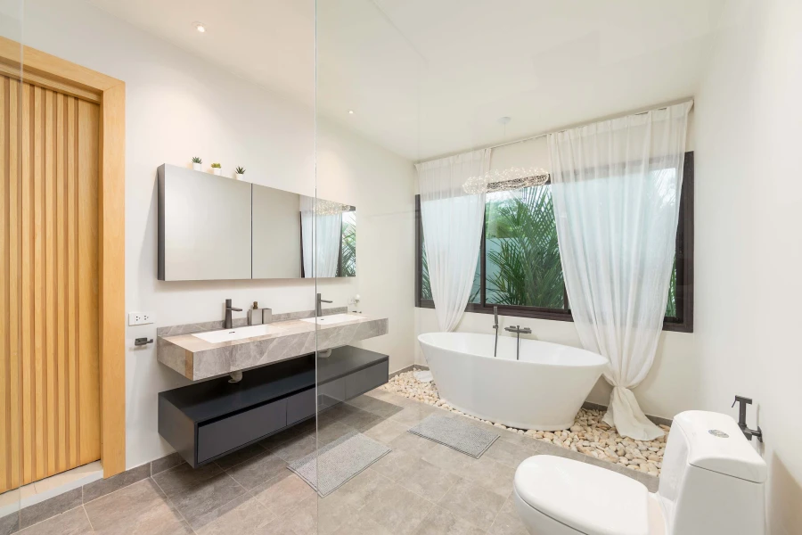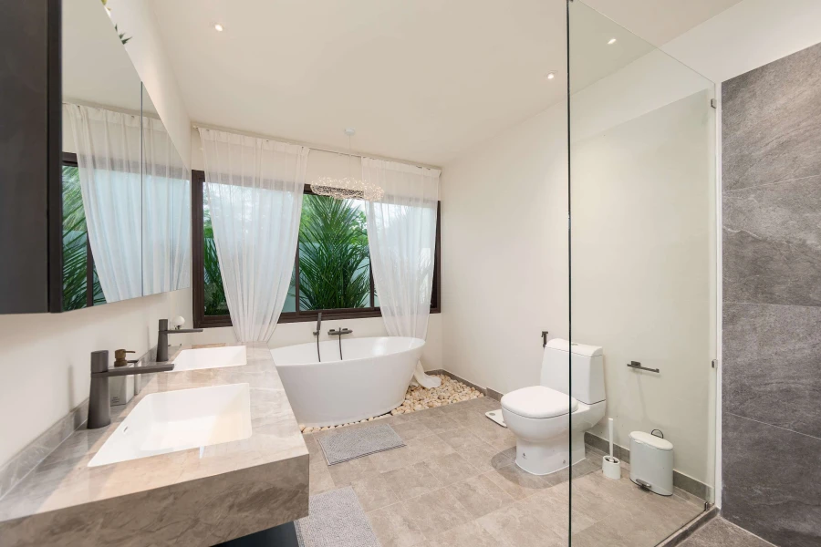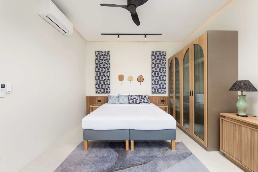 With 120 m² of contemporary living space on a 200 m² plot, this villa comfortably accommodates up to four guests. Each of the two elegant bedrooms features a king-size bed, private bathroom, and pool views. The bathrooms are equipped with high-quality amenities, including a shower and bathtub for ultimate comfort.