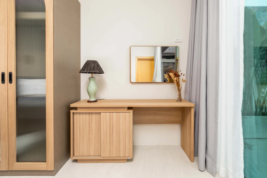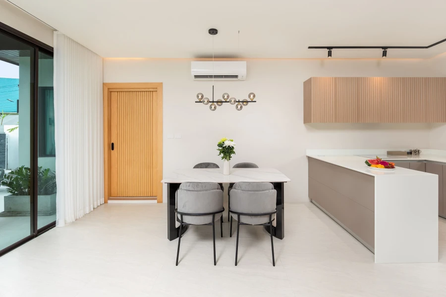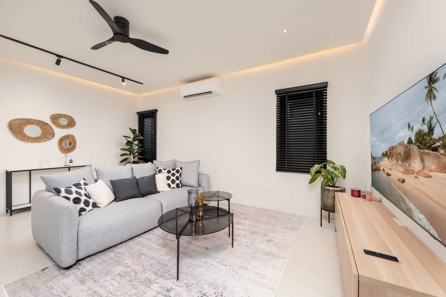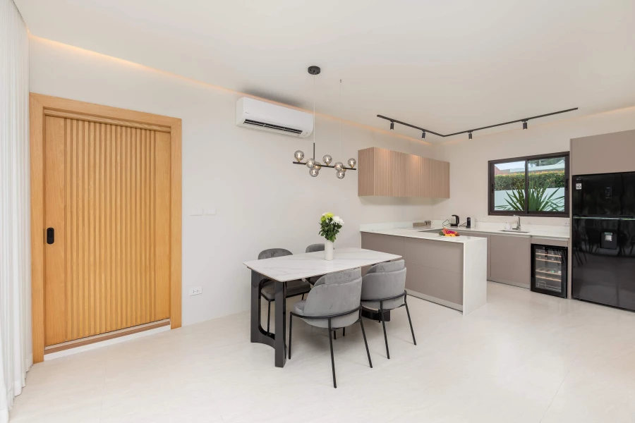 The fully equipped kitchen and dining area provide everything needed for home-cooked meals, while the cozy living room, complete with air conditioning and a smart TV, offers a perfect space to relax. Floor-to-ceiling windows open to a sun-drenched terrace and your private pool, surrounded by tropical greenery—ideal for morning coffee or evening unwinding.