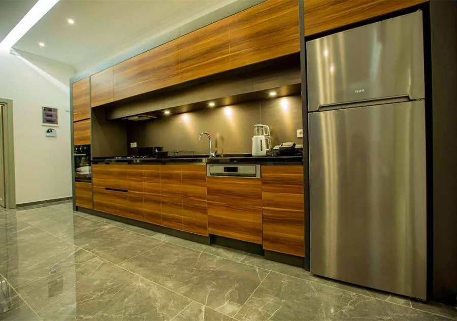 Refrigerator, dishwasher, 4-burner oven (built-in), microwave oven, electric kettle, water dispenser, 4-person dining set, pots, pans, cutlery, etc.