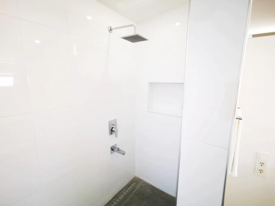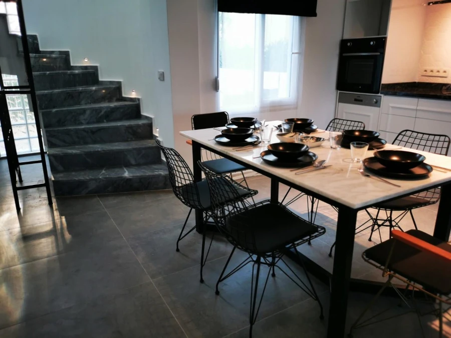 On the ground floor of our villa, there is an American kitchen, a living room with a seating area, TV, air conditioning, and a dining table. On the first floor, there are two bedrooms; one has a double bed, and the other has two single beds. These two bedrooms share a common bathroom. The second floor, which is the attic, features a spacious bedroom with a double bed, an en-suite bathroom with a jacuzzi, and a large terrace. There is also a single sleeping space in the living room. The garden/pool area also includes a shower and a WC.
