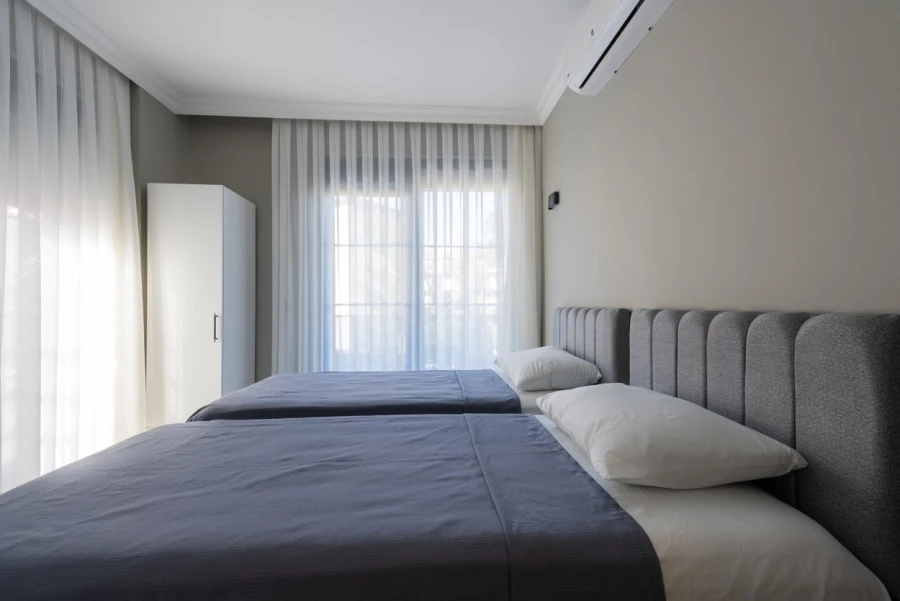 It is also close to sea, markets, food and beverages, entertainment venues. This villa can be preferred for guests who are considering accommodation for 10 people and above, as they are next to each other. İçmeler Neighborhood is known for its quietness and calmness. Also in İçmeler region you may find tours such as '' Daily Boat Tours and Jeep Safari, independent of the House. This villa has a 4 Bedrooms and there are Double or 2 Single Beds in each room. There is also a Turkish Bath. Due to its bed capacity, it is a villa for 8 people, but 10 people can be accepted with owner's Approval. İn the pool area there are 5 Sunbeds, designed for you to have a nice time by the pool with a seating group. It is 800 x 400 x 140 cm - 220 cm in size. There are 5 sun loungers, a swing, a winter garden and a garden seating group by the pool.