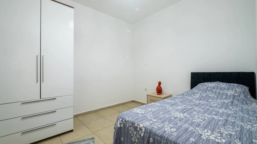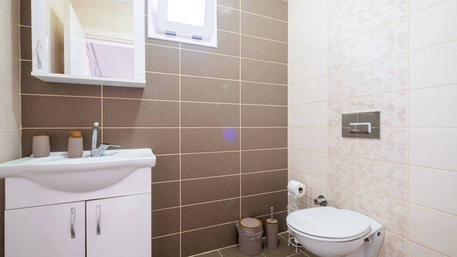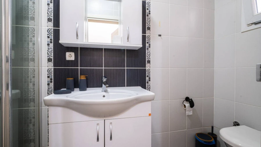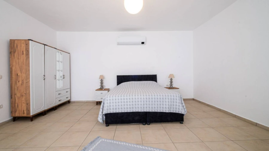 Designed as a triplex, the villa's basement floor features two bedrooms, a shared bathroom, and a laundry room. The first bedroom on this floor has a double bed, a sofa bed for one person, and air conditioning. The second bedroom contains a single bed and remains naturally cool due to its position, so no air conditioning is needed. The laundry room includes a washing machine, an iron, and an ironing board.