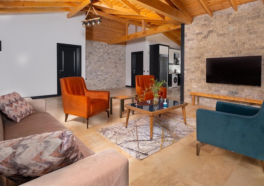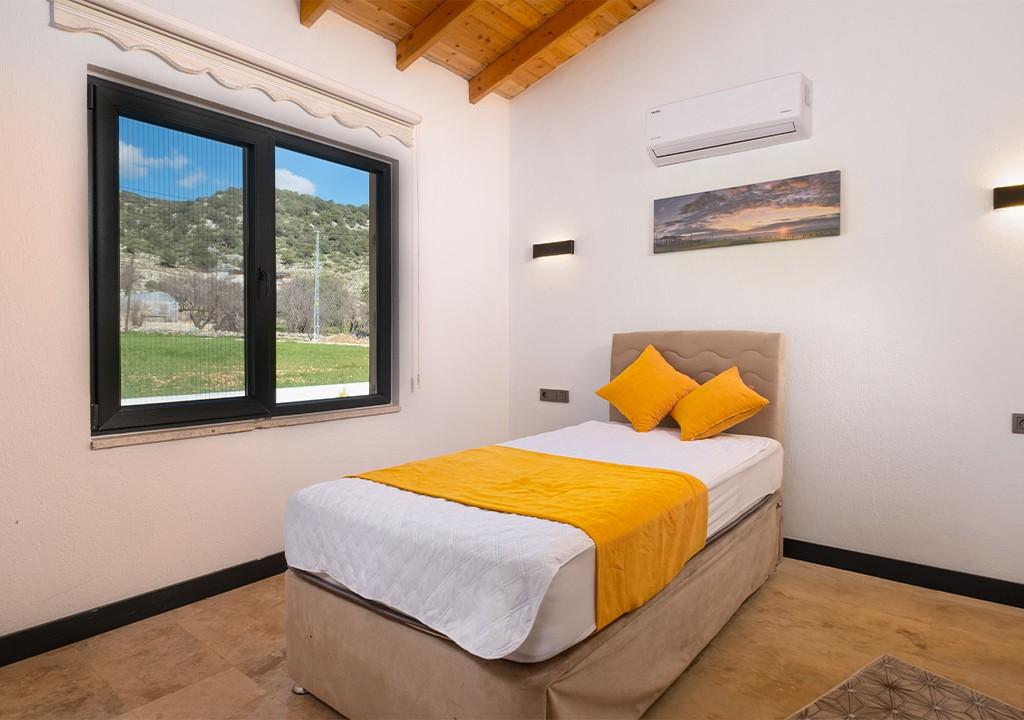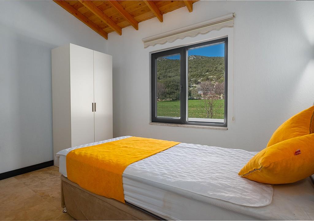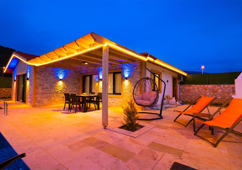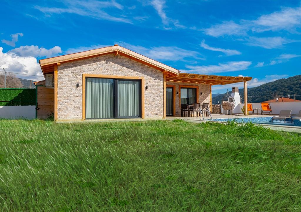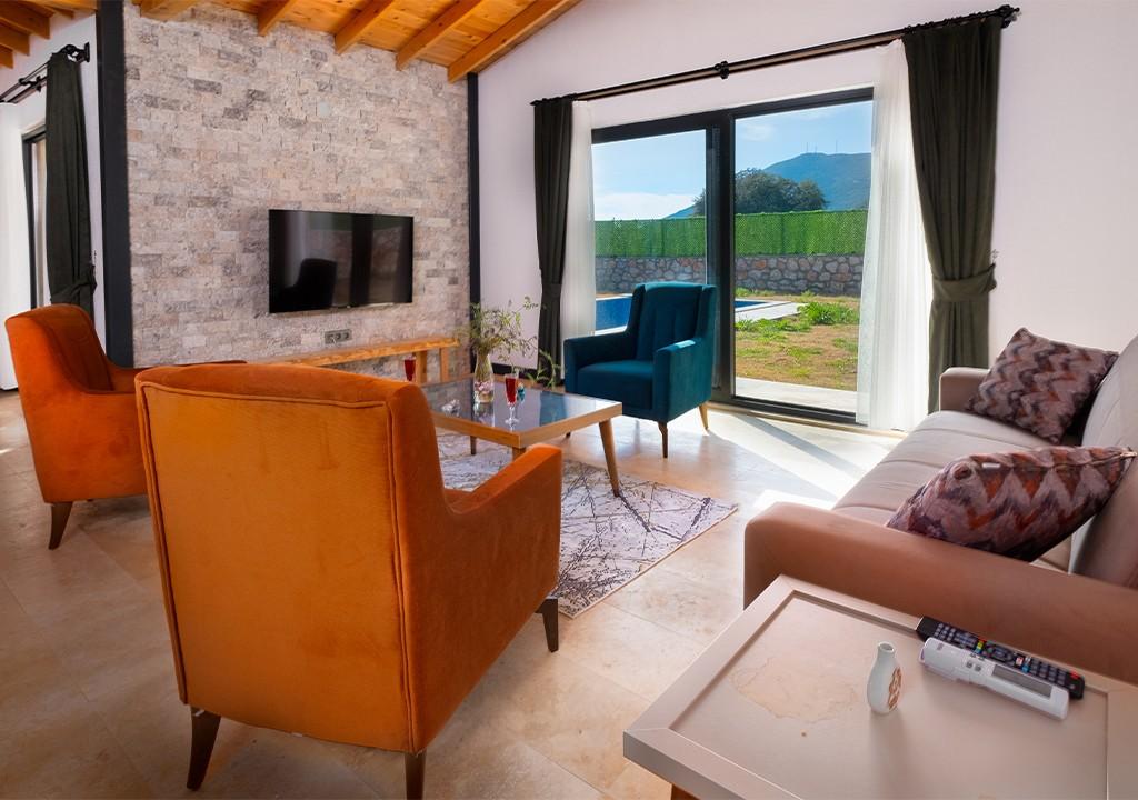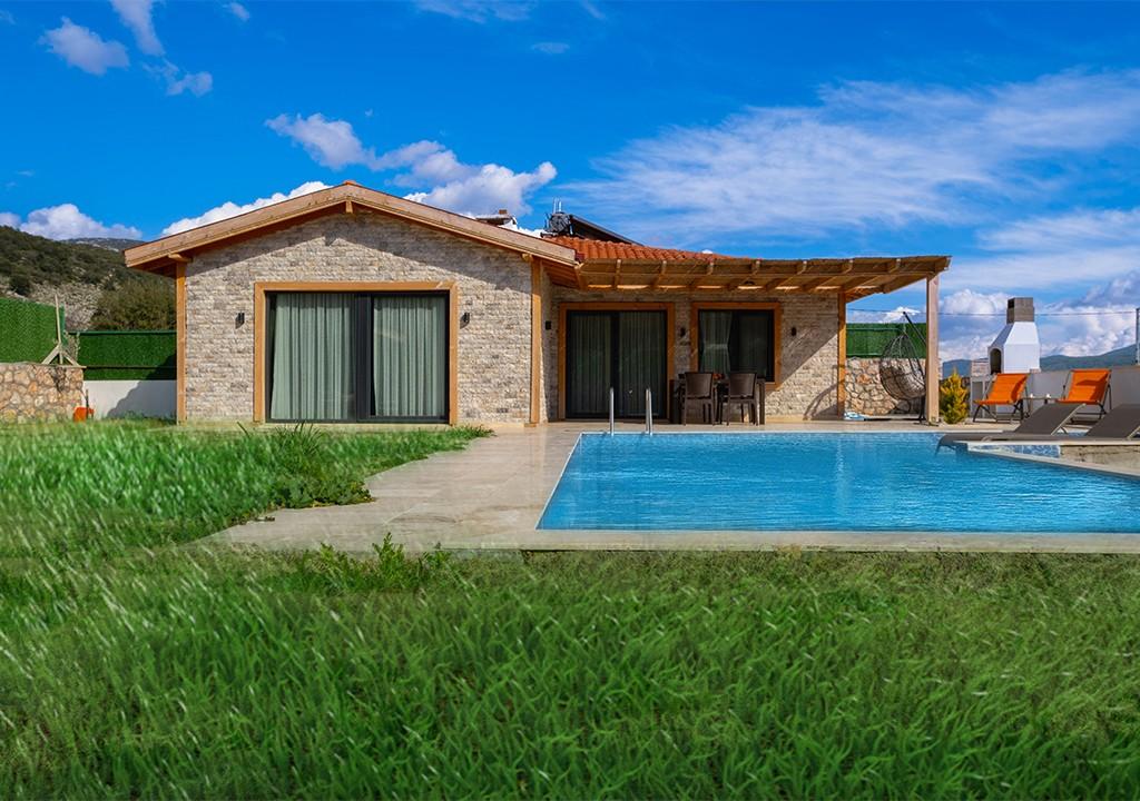 Villa, located amidst greenery in the village of Sarıbelen in Kalkan, is a conservative villa with 2 bedrooms and a pool area that is not visible from the outside.