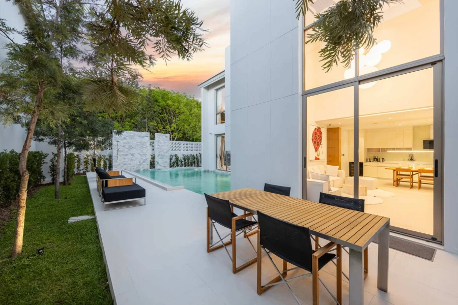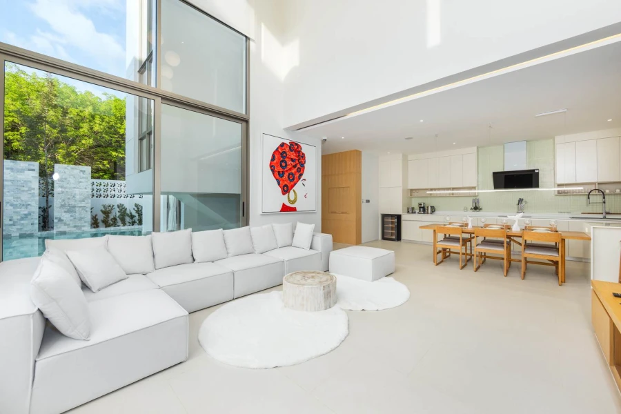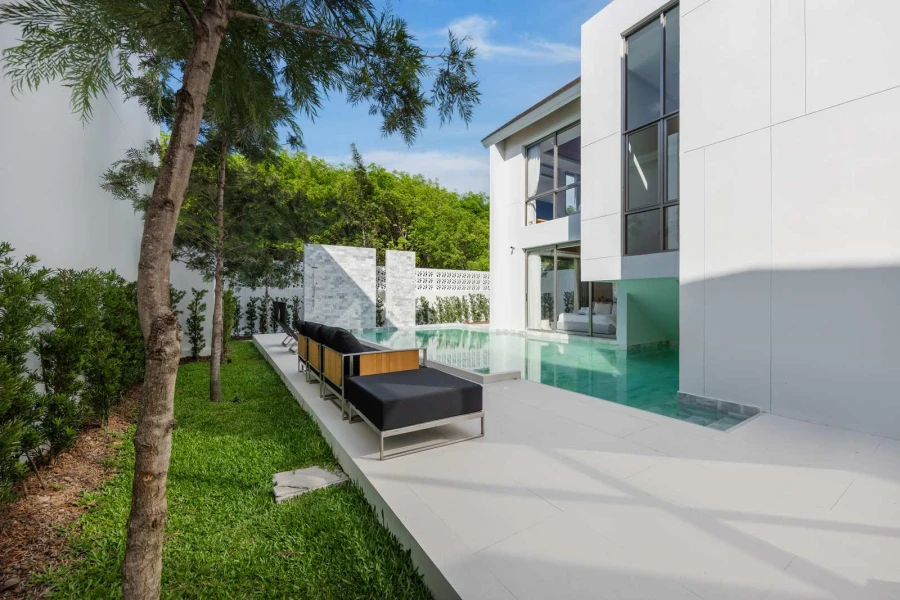 This stunning two-story, three-bedroom villa offers modern design, spacious interiors, and seamless indoor-outdoor living. Floor-to-ceiling windows open to a lush garden and a sparkling private pool—your own serene sanctuary. The fully equipped kitchen, stylish terrace, and cozy lounge areas make it perfect for families or couples seeking a luxurious getaway.