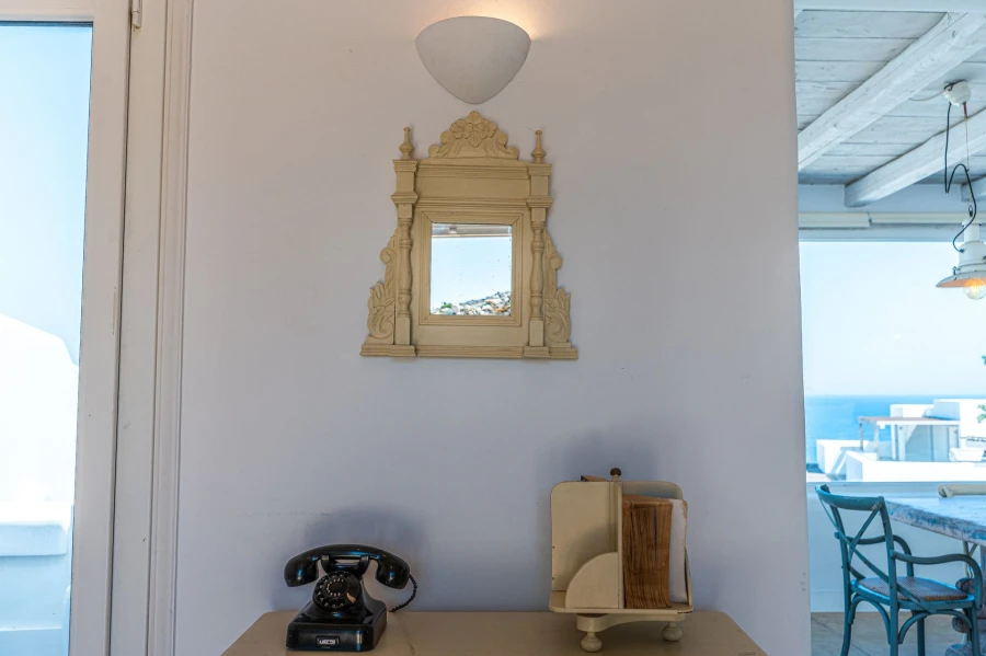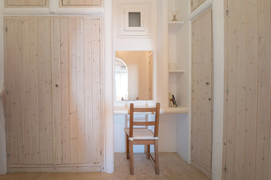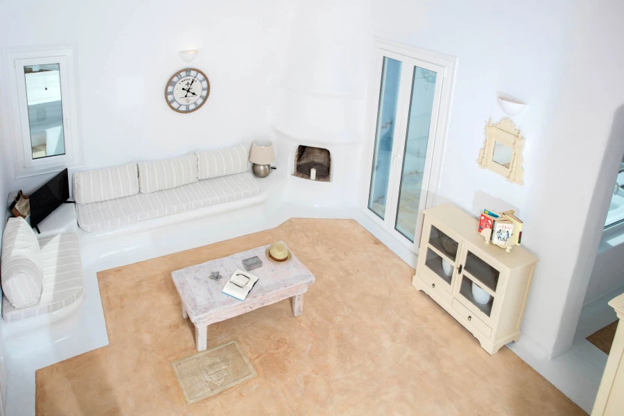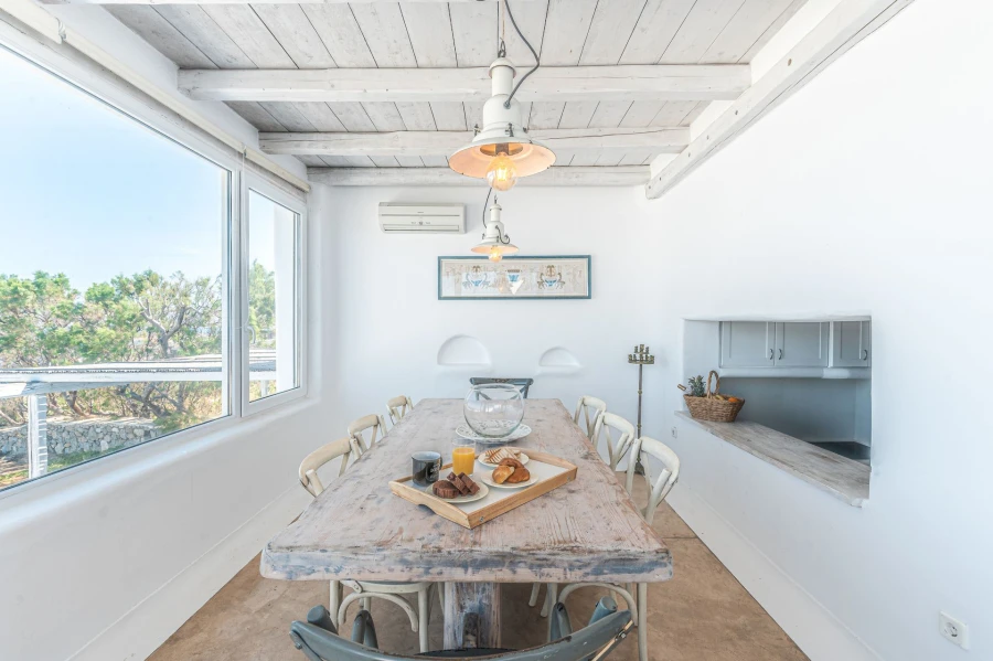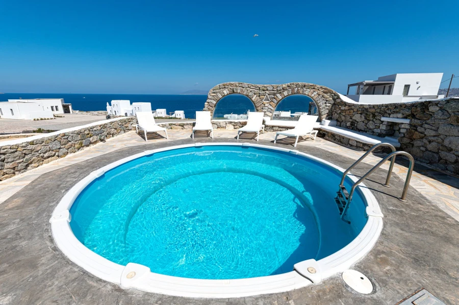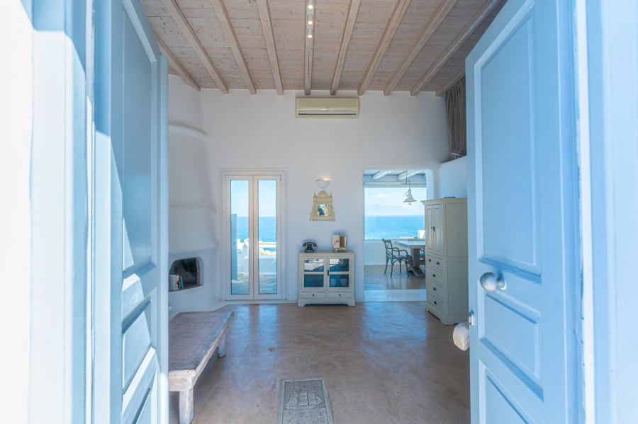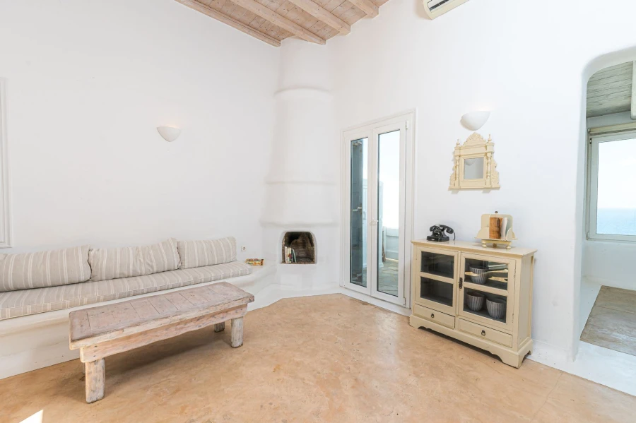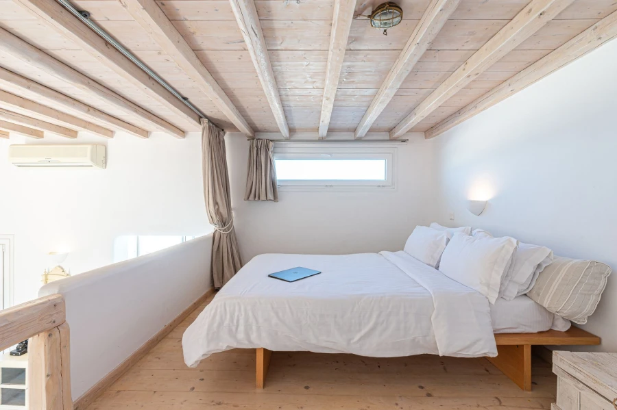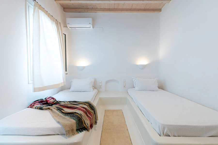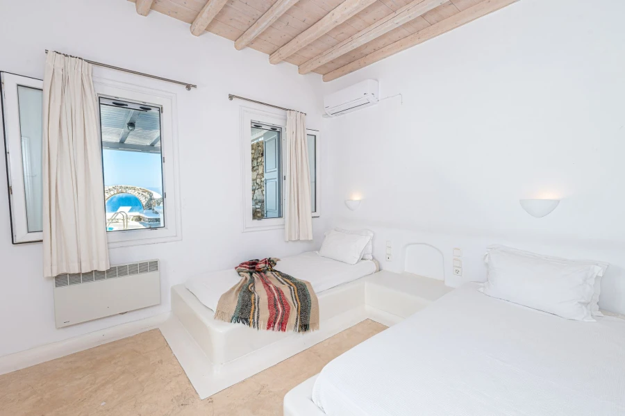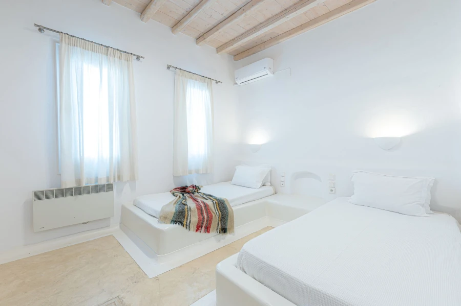 Originally built in 2008 and fully renovated in 2022, the villa retains its Mykonian character—whitewashed walls, smooth curves, wooden beams, and built-in furnishings—enhanced with marble floors, sunken bathtubs, and contemporary finishes. The minimalist interior embraces soft white and off-white tones, creating a soothing, stylish atmosphere.