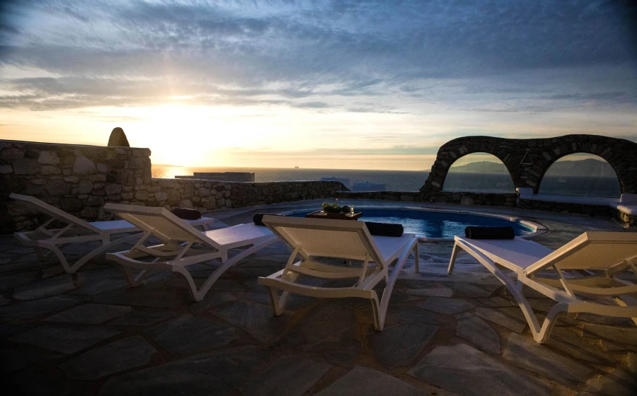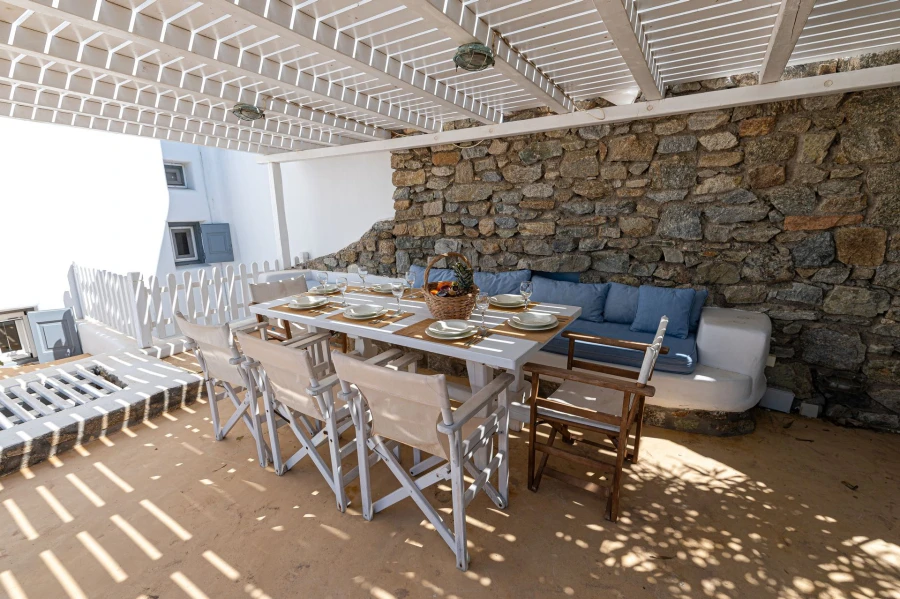 Our villa is a beautifully renovated three-level villa (130 sqm) in the peaceful area of Pouli, Mykonos. Blending traditional Cycladic charm with modern elegance, this serene retreat boasts panoramic views of the Aegean Sea, Delos, Rhenia, and Tinos.