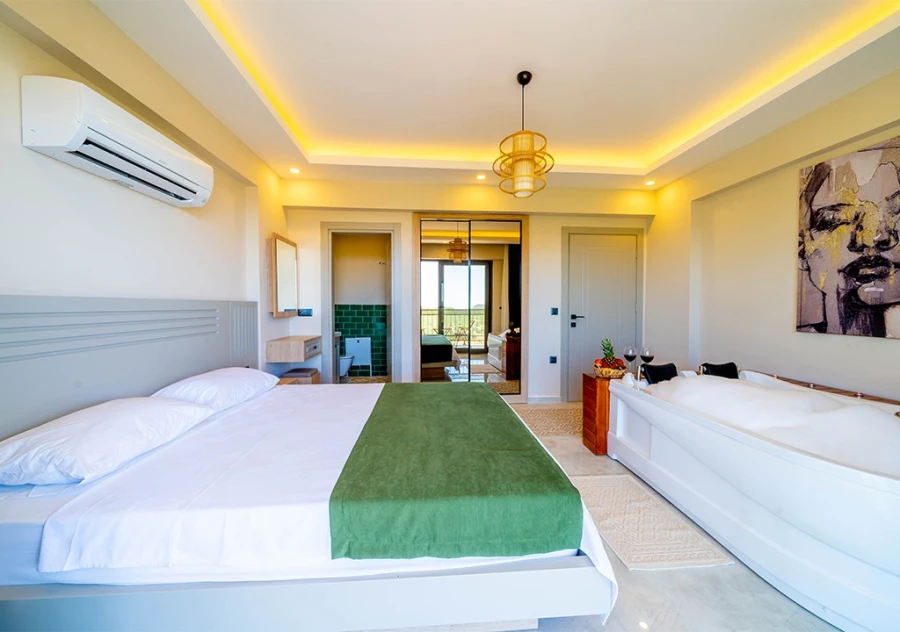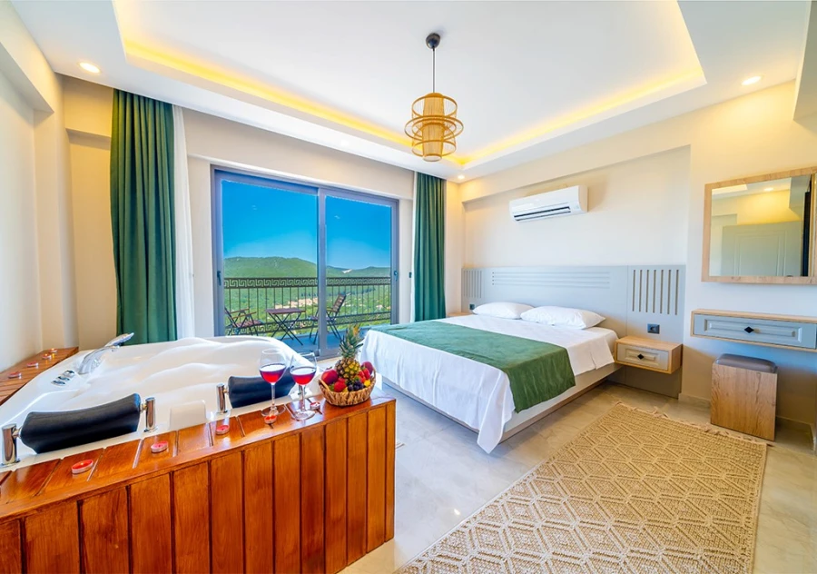 Details: Double bed, vanity table, nightstand, air conditioning, wardrobe, jacuzzi bath, and toilet.