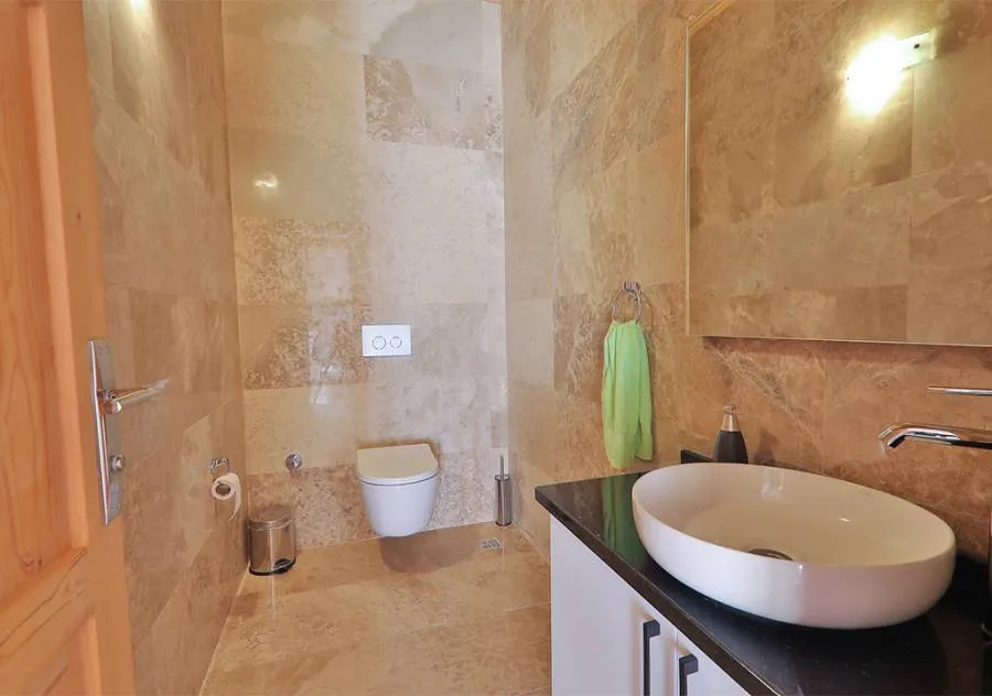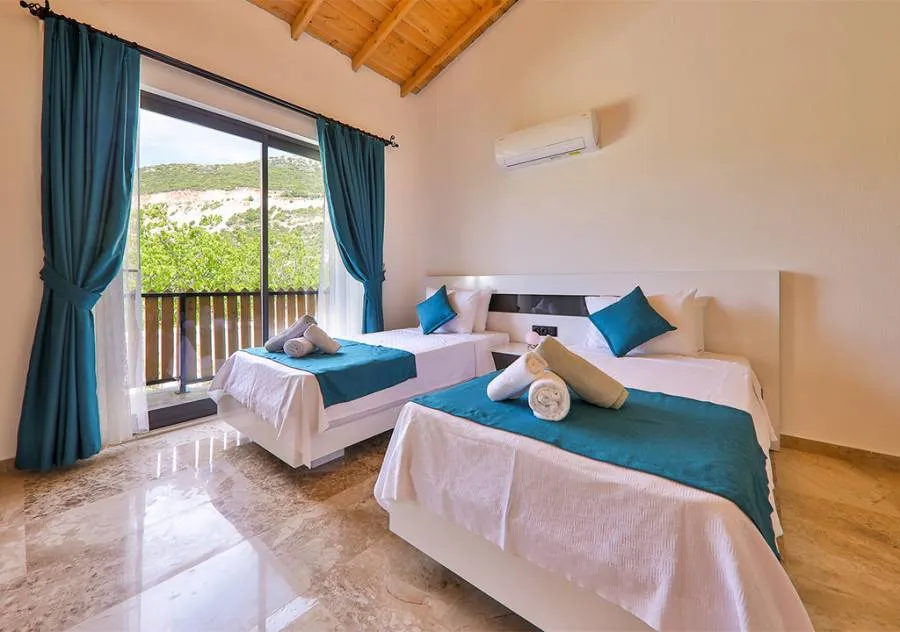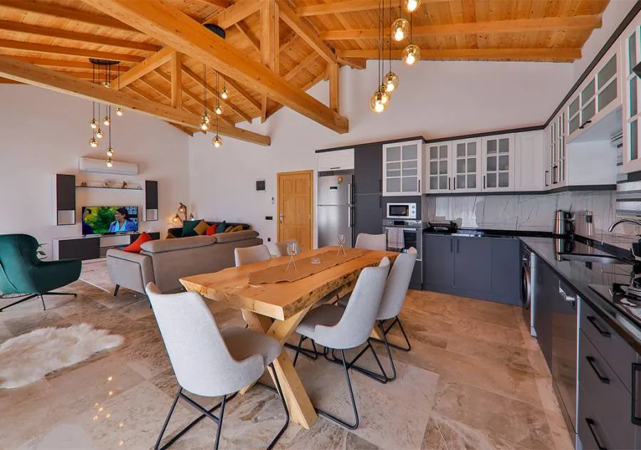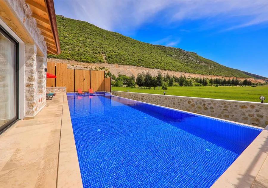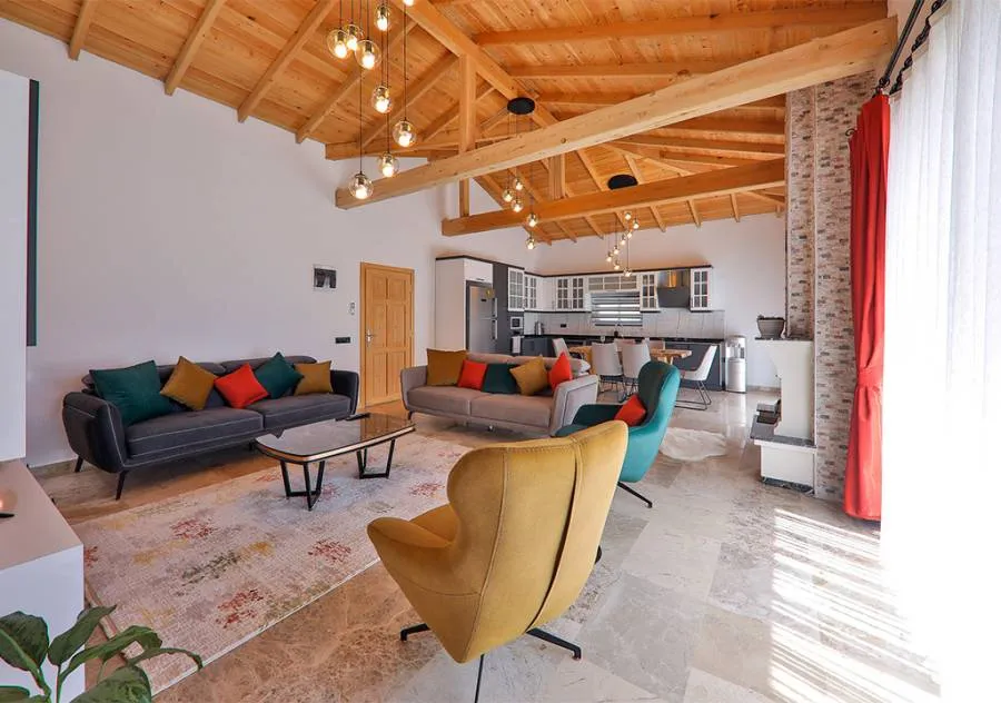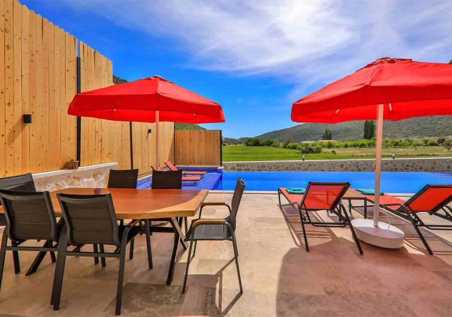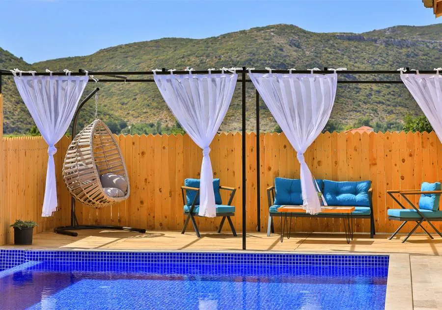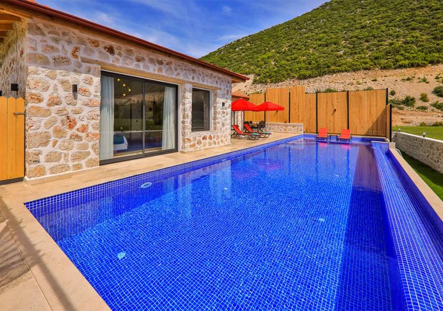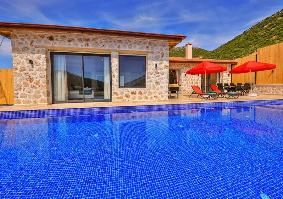 Villa, located in the Bezirgan area of Kalkan, is a 2-bedroom villa nestled in nature, away from the hustle and bustle of the city. With its hammam and sauna, it offers you a delightful holiday experience.