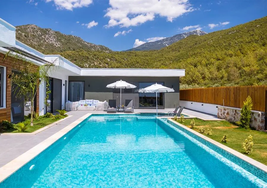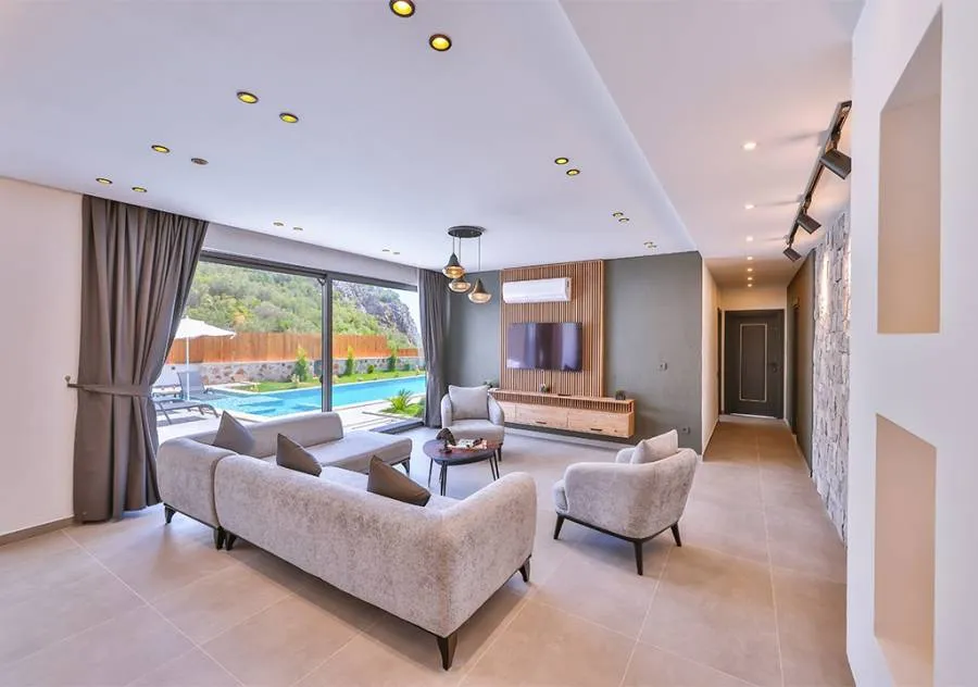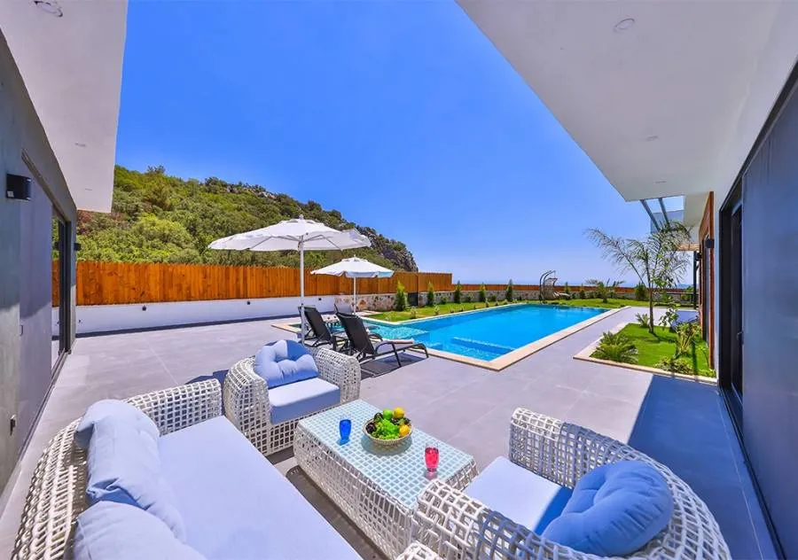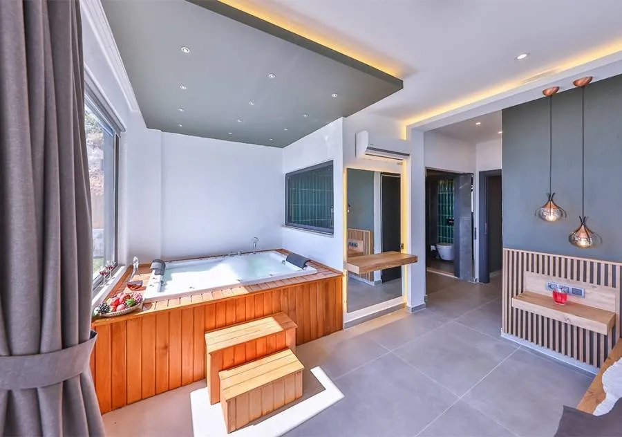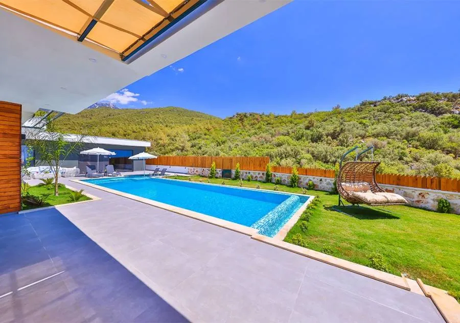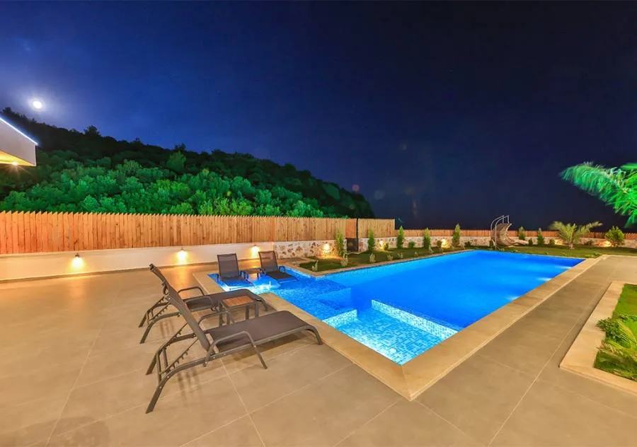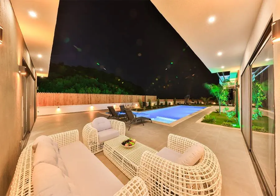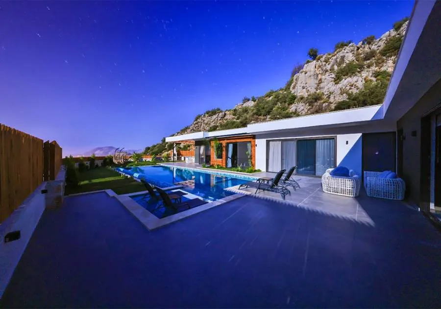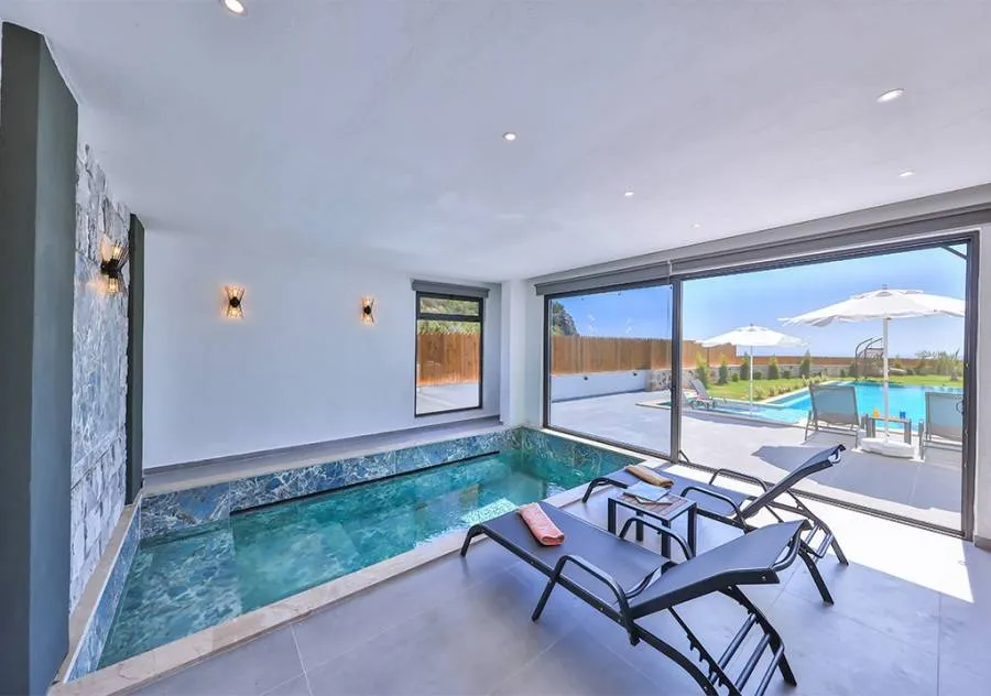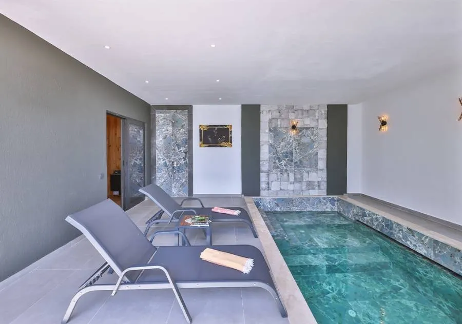 Villa, located in the Çavdır region of Kalkan, has 2 bedrooms and a capacity for 4 people. Its secluded location amidst nature, indoor heated pool, and sauna make it an ideal choice for conservative families.