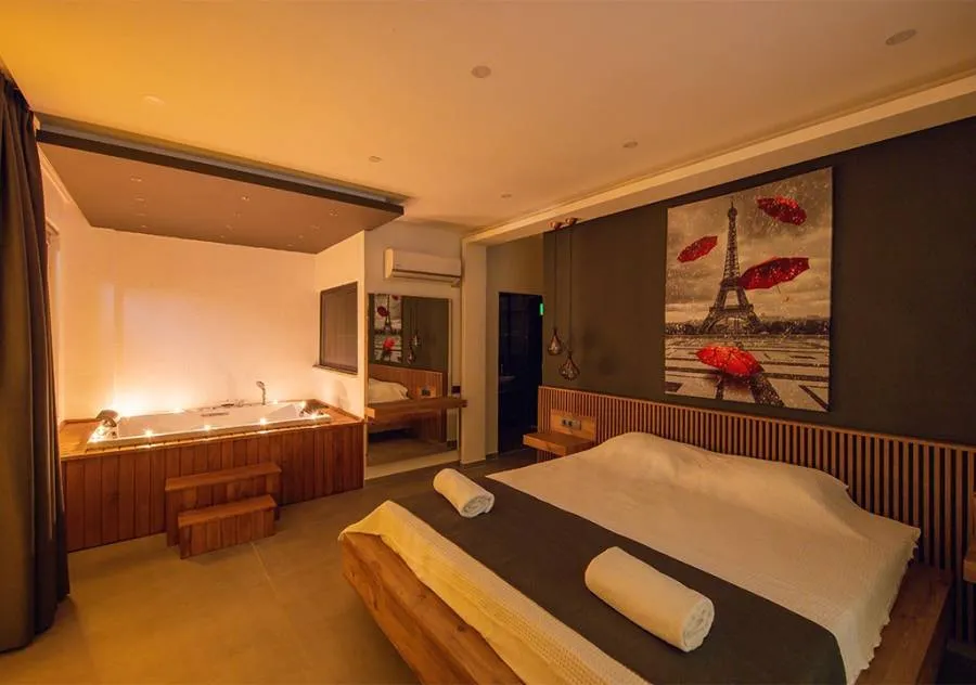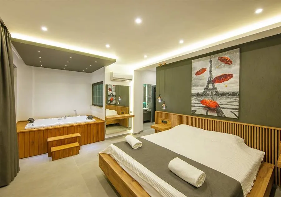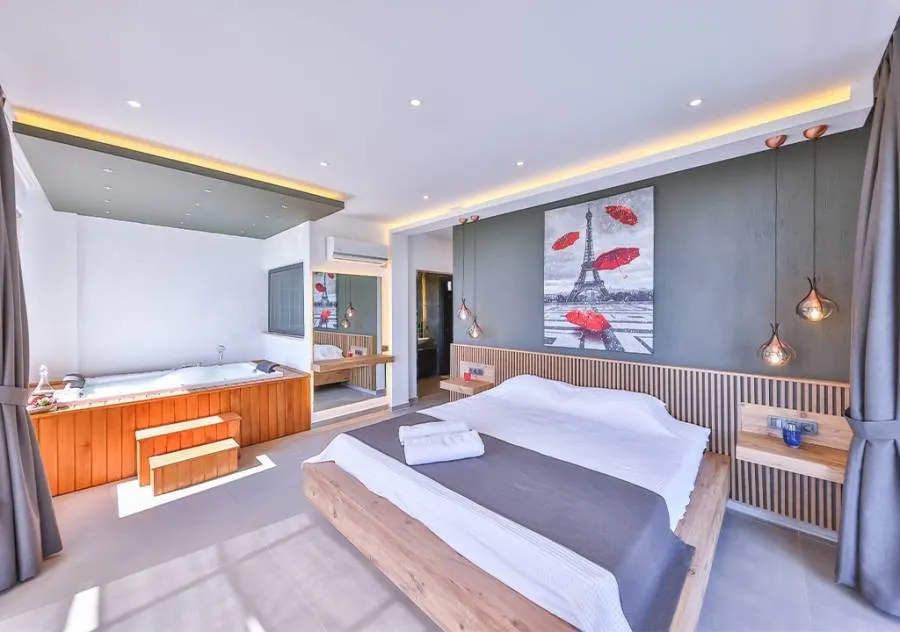 Double bed, wardrobe, dressing table, air conditioning, jacuzzi, bathroom.