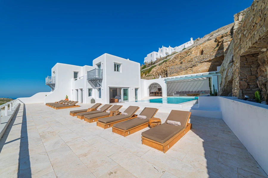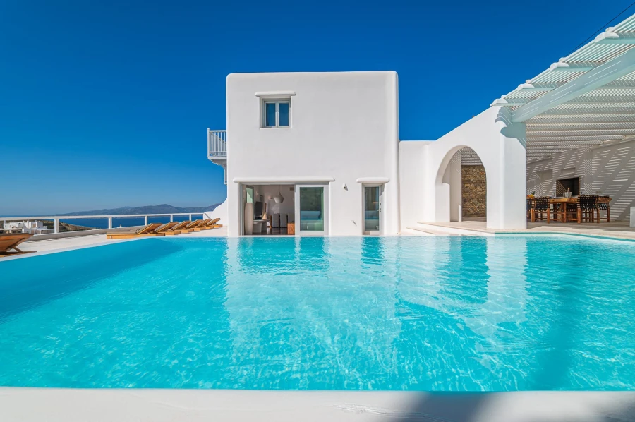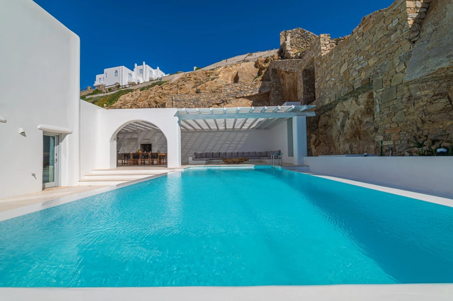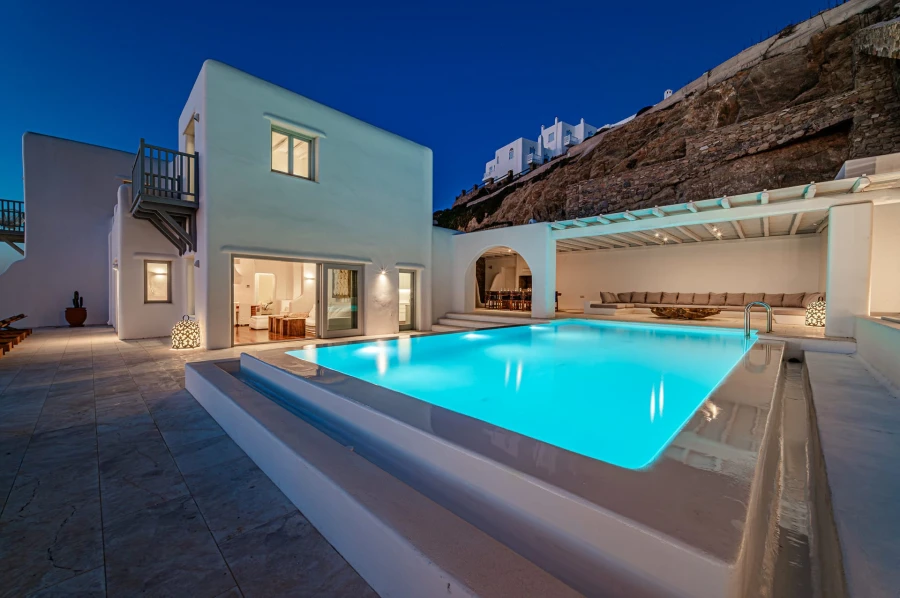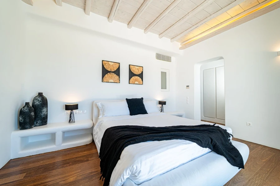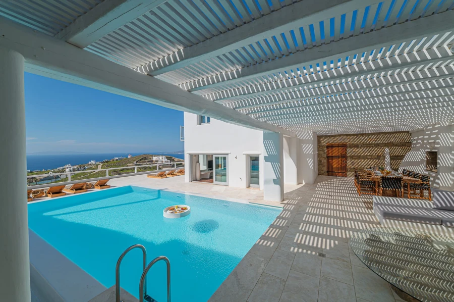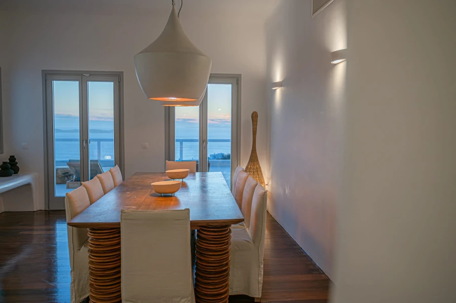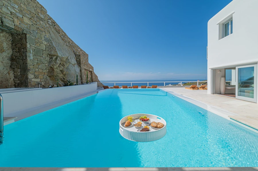 Blending traditional Cycladic architecture with sleek, modern design, the villa offers a refined atmosphere both indoors and out. The highlight is a 50 m² infinity pool that seems to melt into the horizon, offering front-row seats to breathtaking sunsets.