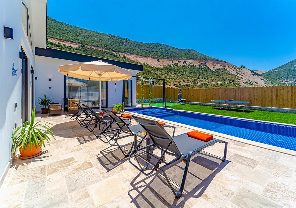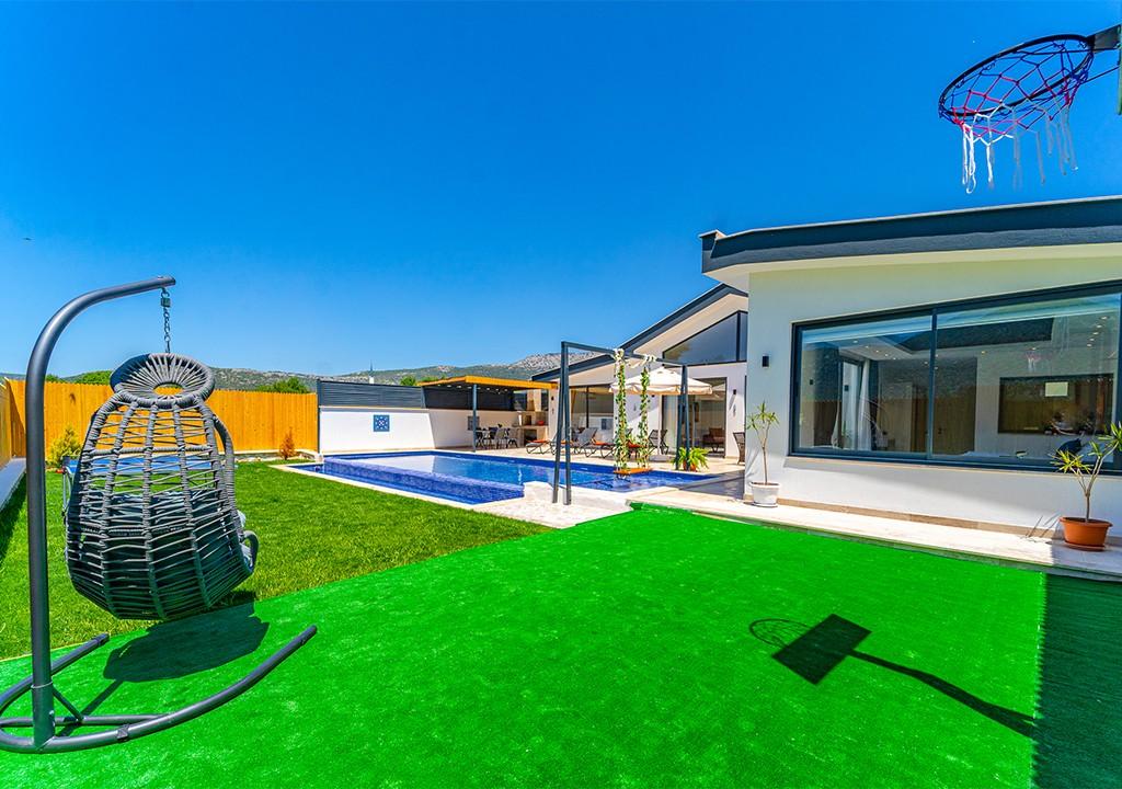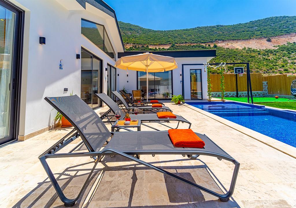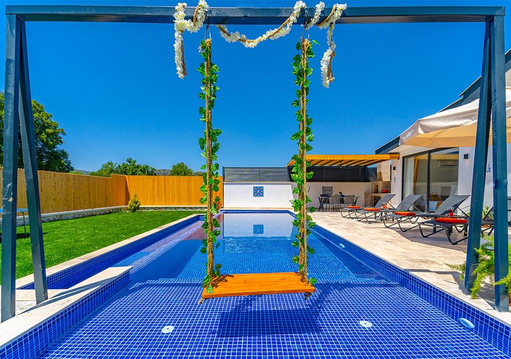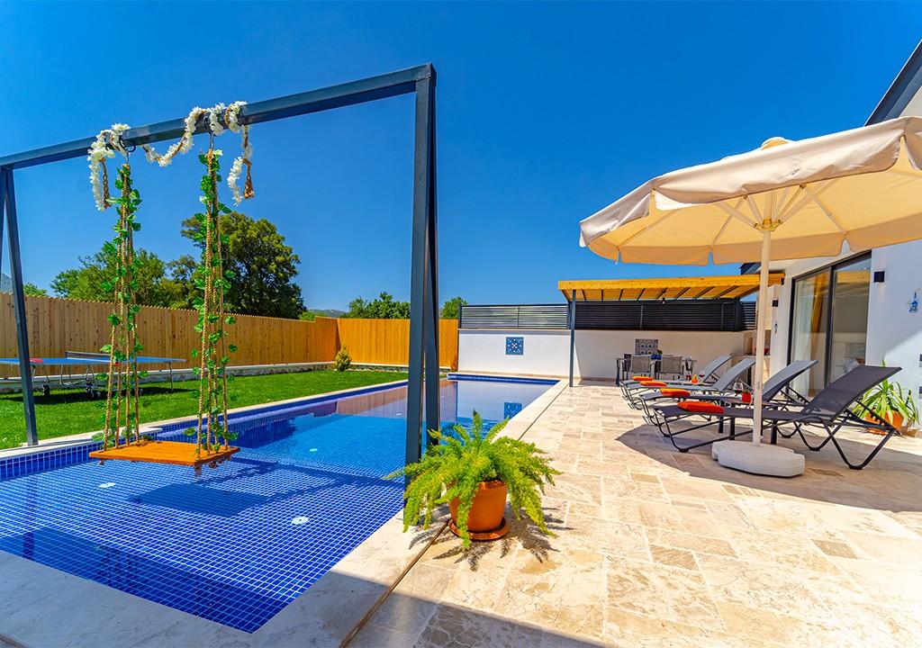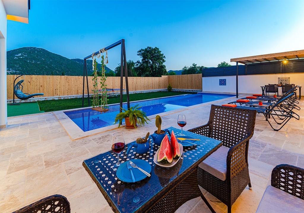 Located in the village of Bezirgan in Kalkan, Villa is nestled amidst greenery. With 2 bedrooms and a capacity for 4 people, the pool area and garden are not visible from the outside, making it an ideal choice for conservative families and honeymoon couples.