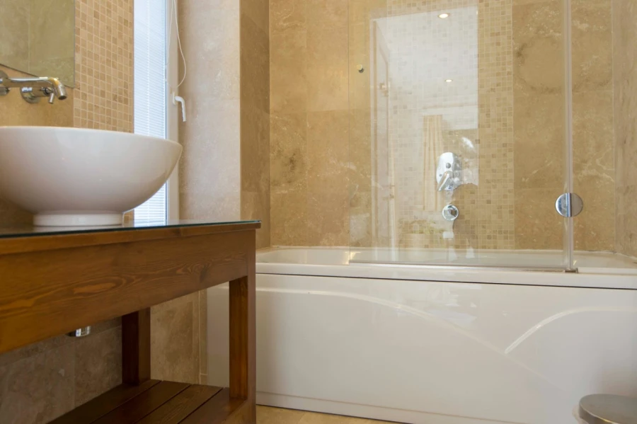 This spacious villa features five bedrooms and five en-suite bathrooms, ensuring maximum privacy and convenience for guests. All bedrooms are equipped with air conditioning. Two bedrooms have twin beds and en-suite bathrooms with showers. Two other bedrooms feature double beds and jacuzzi-equipped en-suite bathrooms. The living room is also air-conditioned, providing a comfortable communal space. Additionally, the fifth bedroom is located in a separate section of the property, featuring a double bed, en-suite bathroom, and air conditioning.