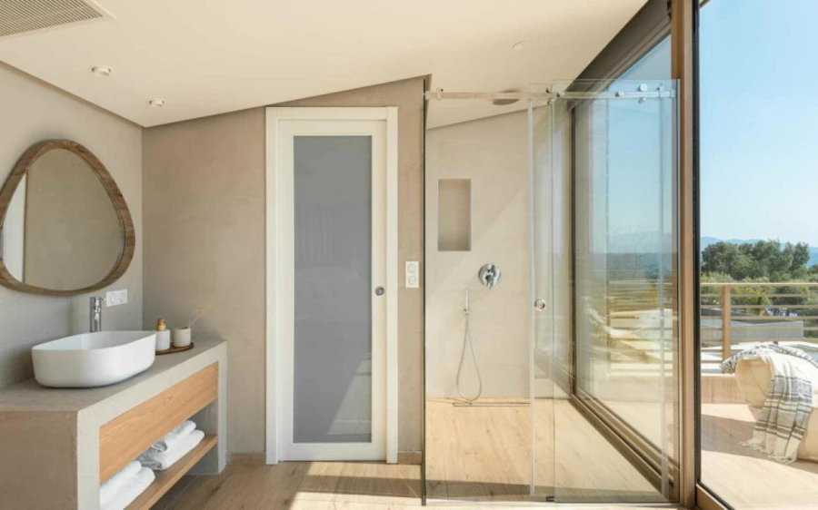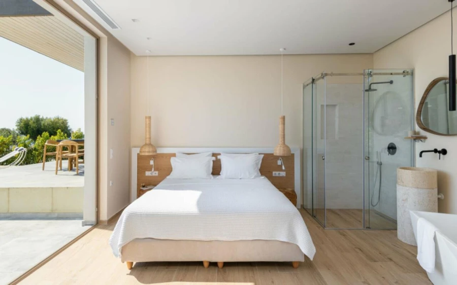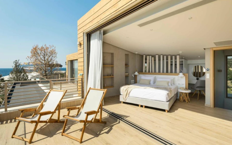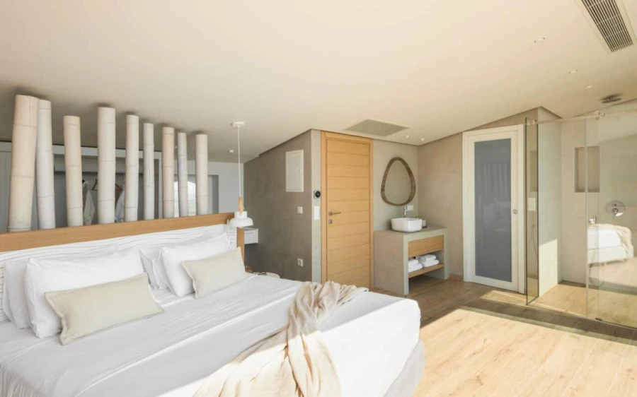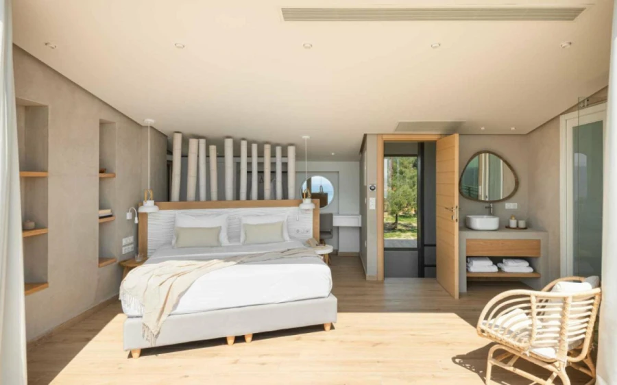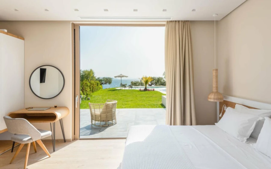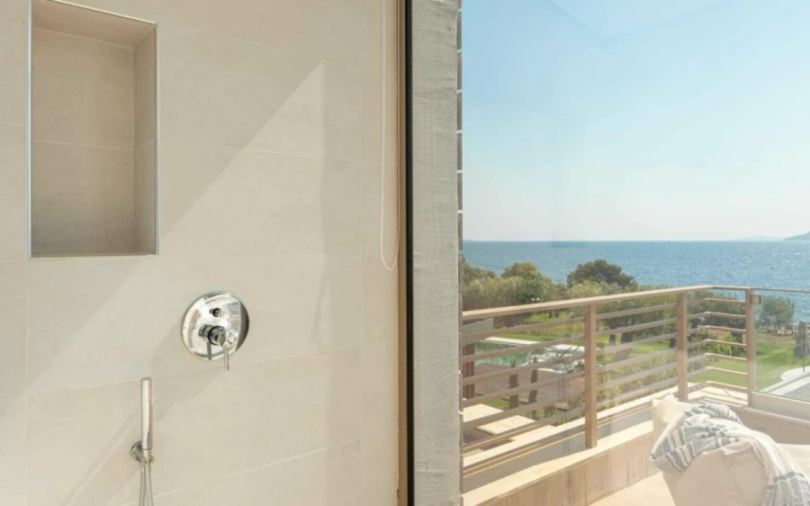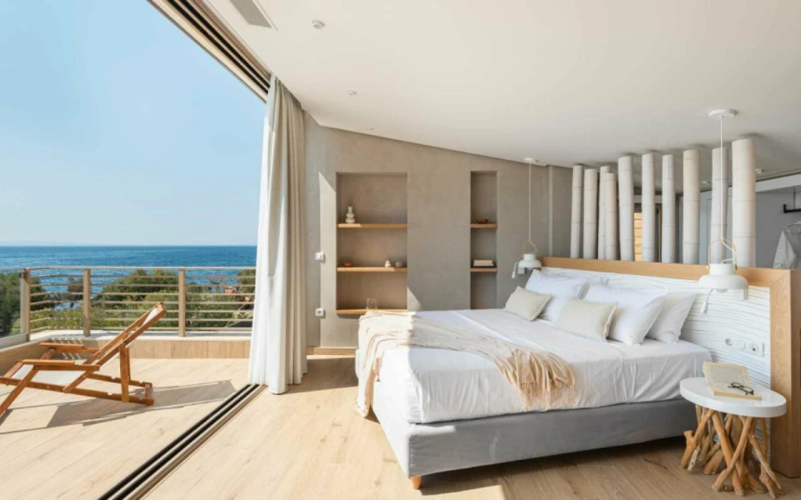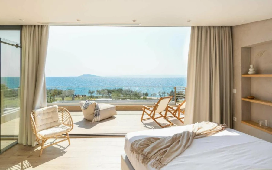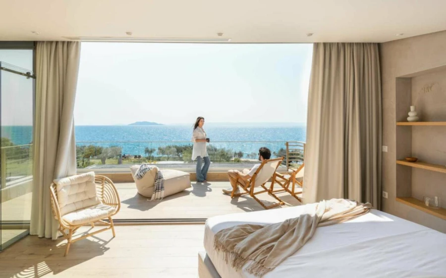 The top floor is dedicated to a private suite, complete with floor-to-ceiling glass doors that frame breathtaking views—from the Toroneos Gulf and Kelyfos Island to the Kassandra peninsula and even Mount Olympus on the horizon.