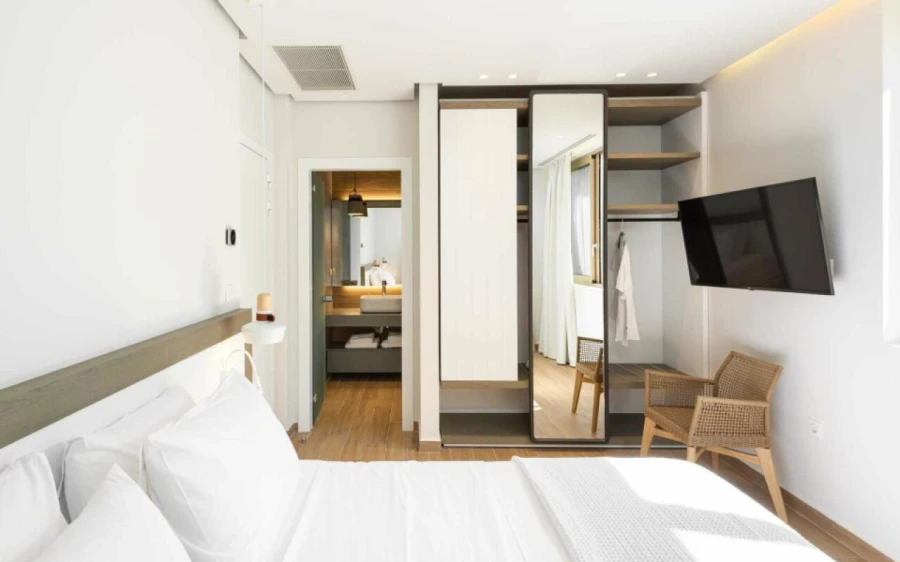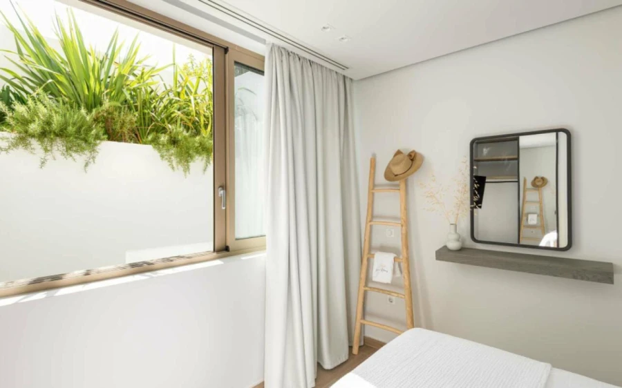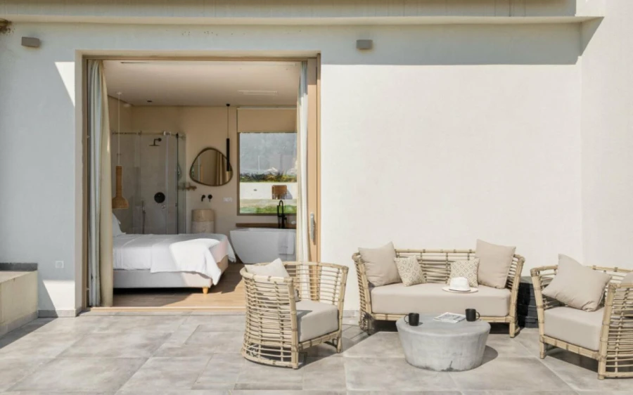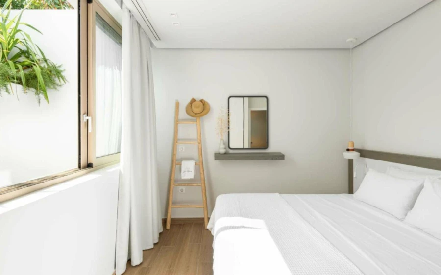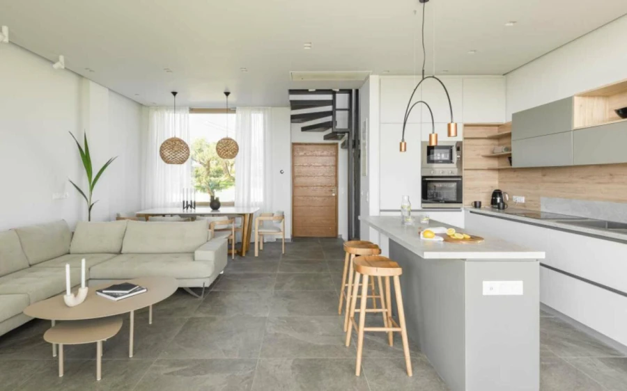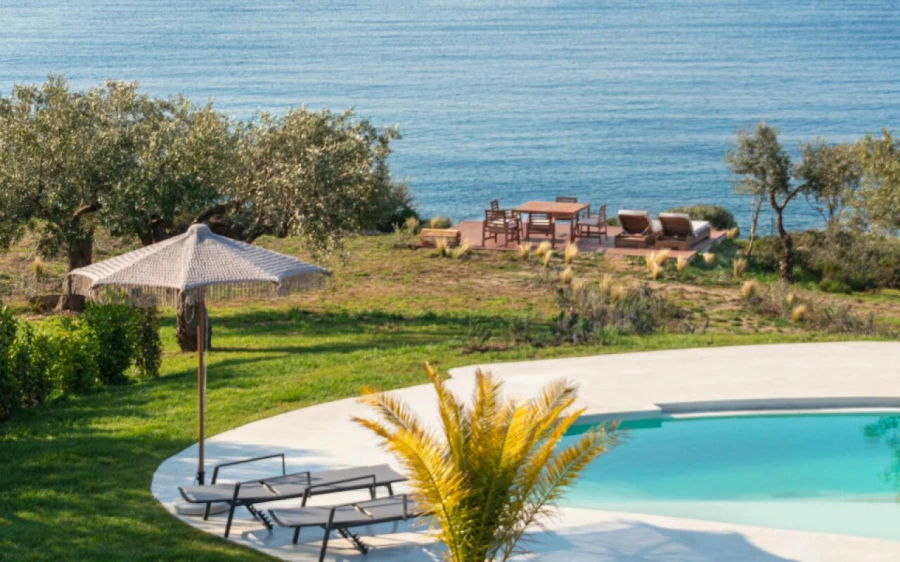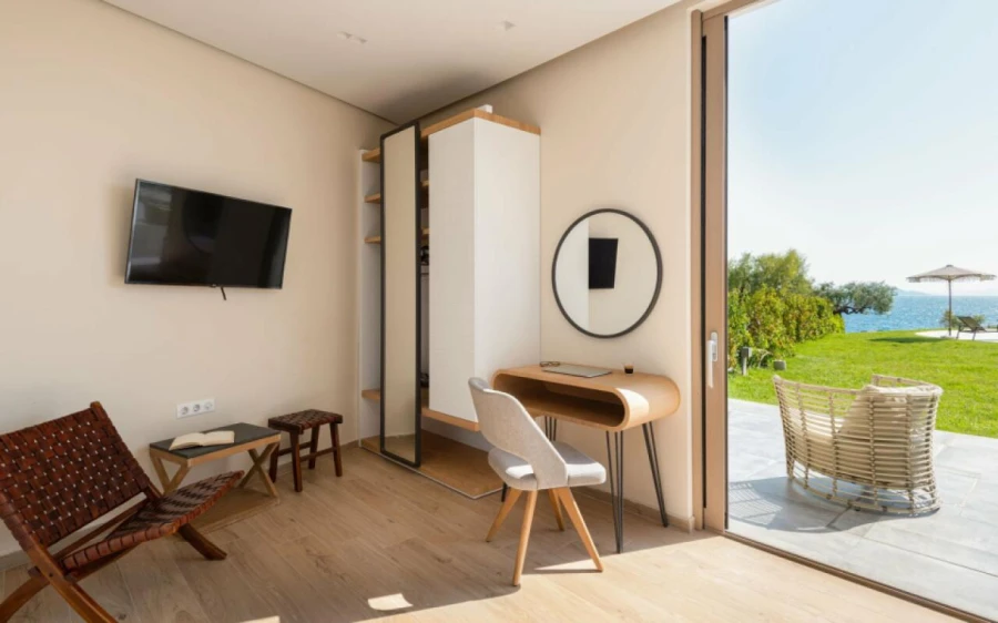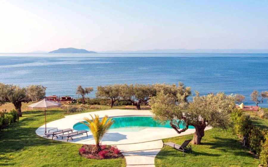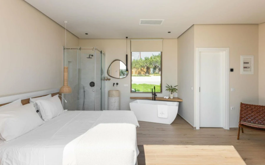 The top floor is dedicated to a private suite, complete with floor-to-ceiling glass doors that frame breathtaking views—from the Toroneos Gulf and Kelyfos Island to the Kassandra peninsula and even Mount Olympus on the horizon.