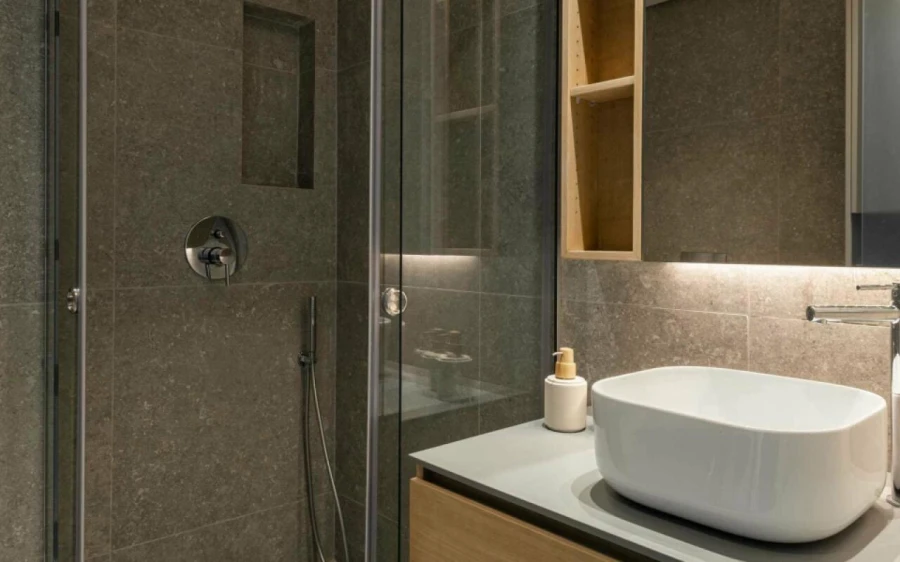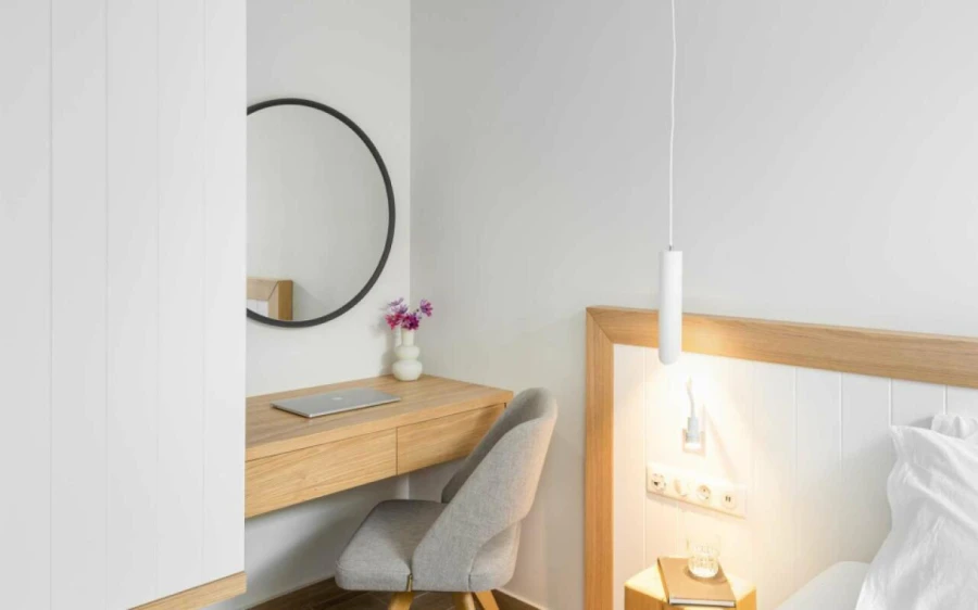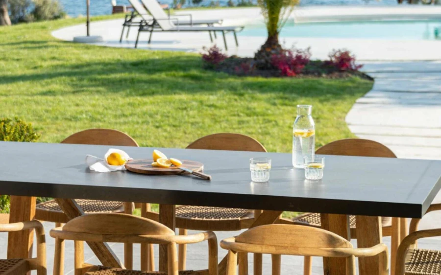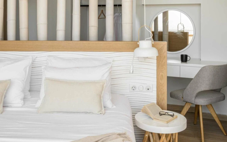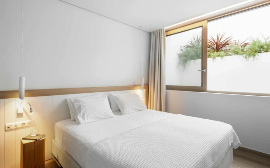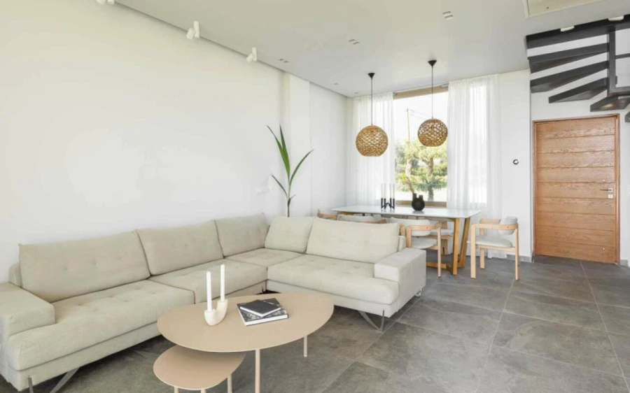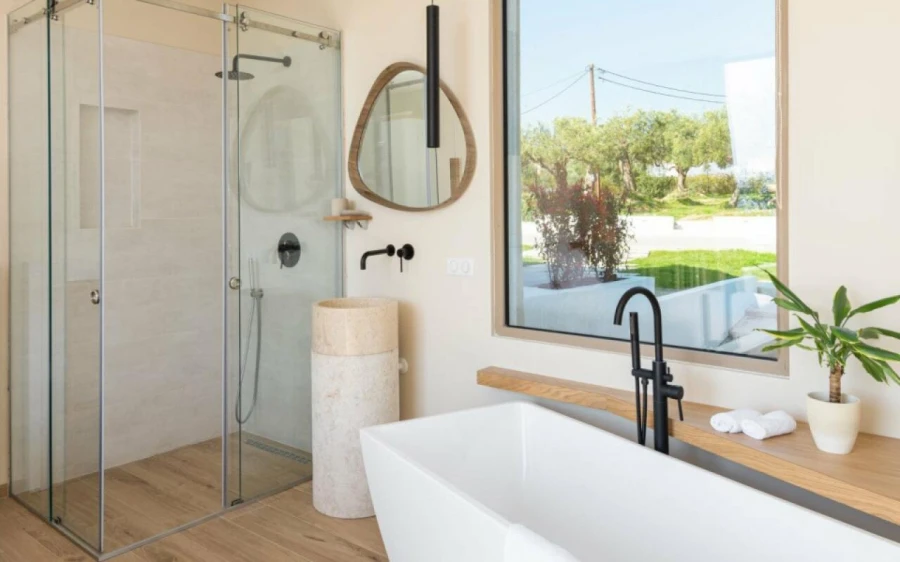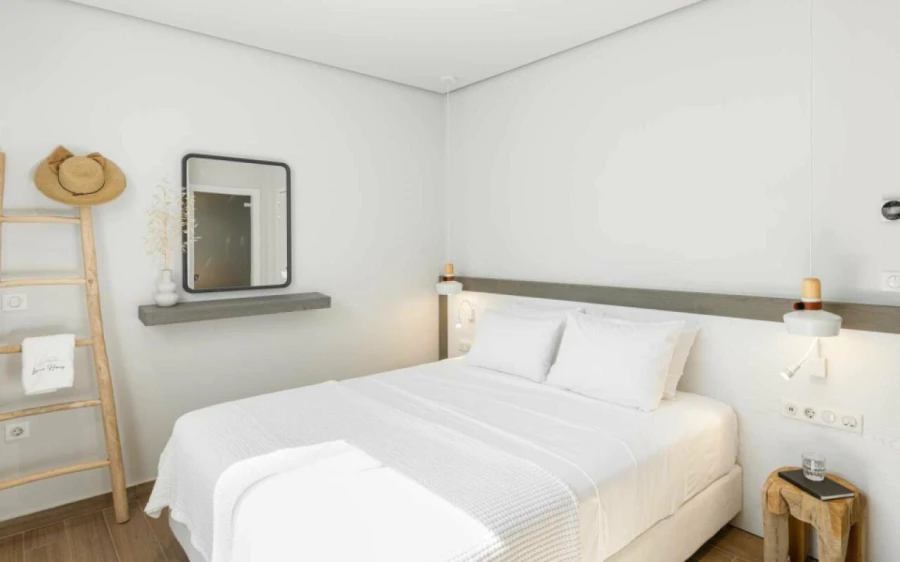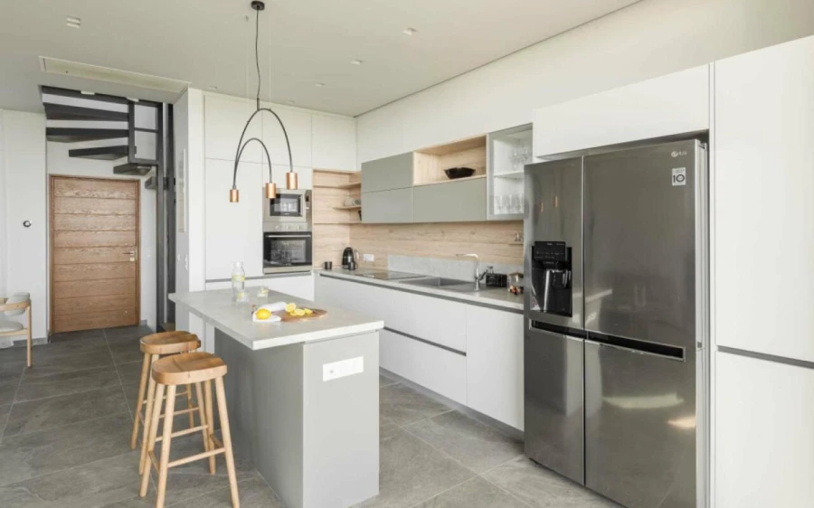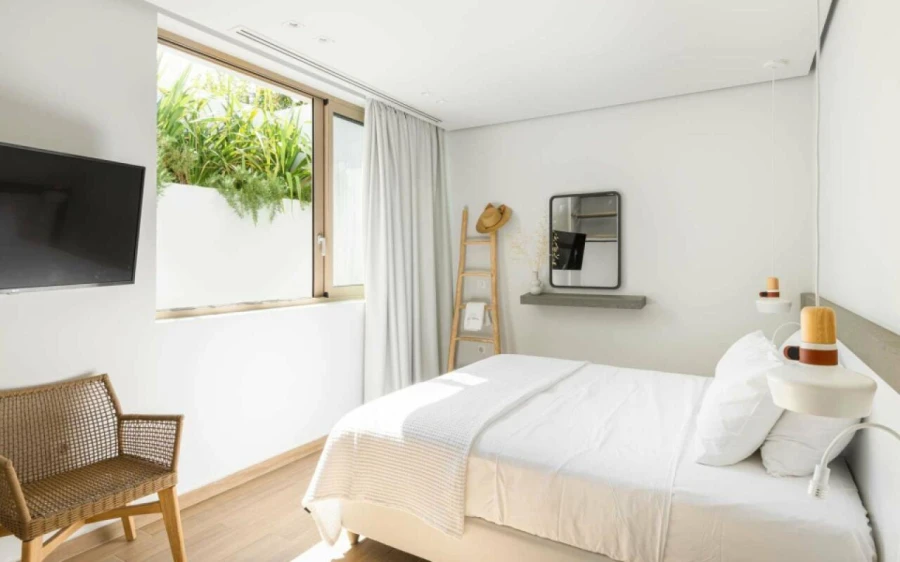 The top floor is dedicated to a private suite, complete with floor-to-ceiling glass doors that frame breathtaking views—from the Toroneos Gulf and Kelyfos Island to the Kassandra peninsula and even Mount Olympus on the horizon.