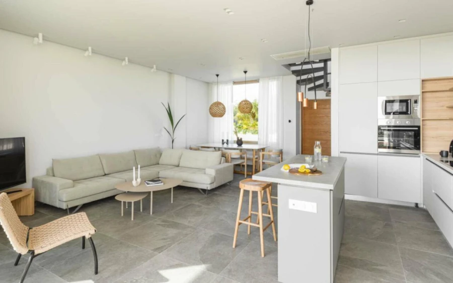 On the ground floor, an open-plan layout connects a fully equipped kitchen, dining area, and cozy living space with TV. Outdoor terraces with shaded pergolas offer additional spots to dine or unwind.