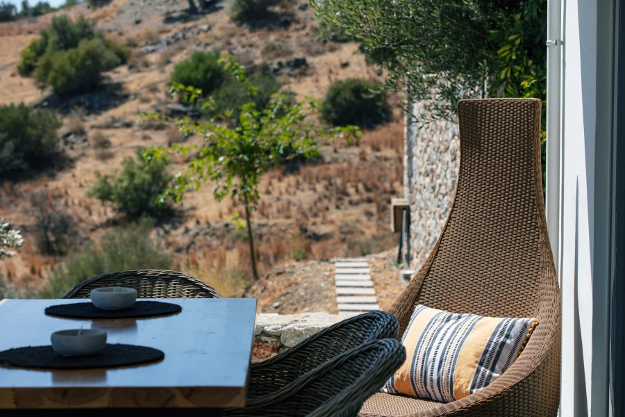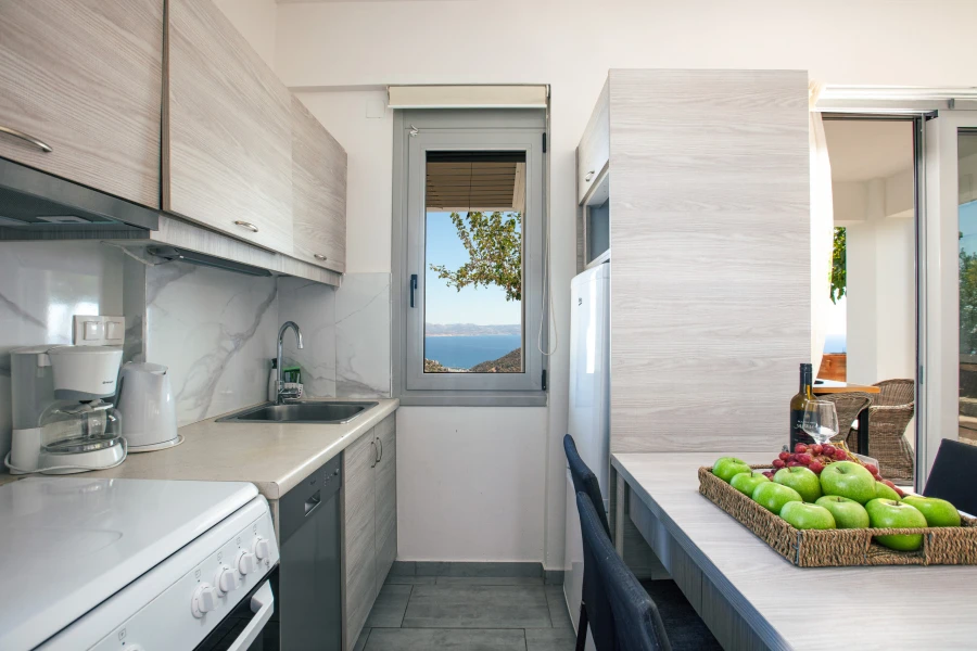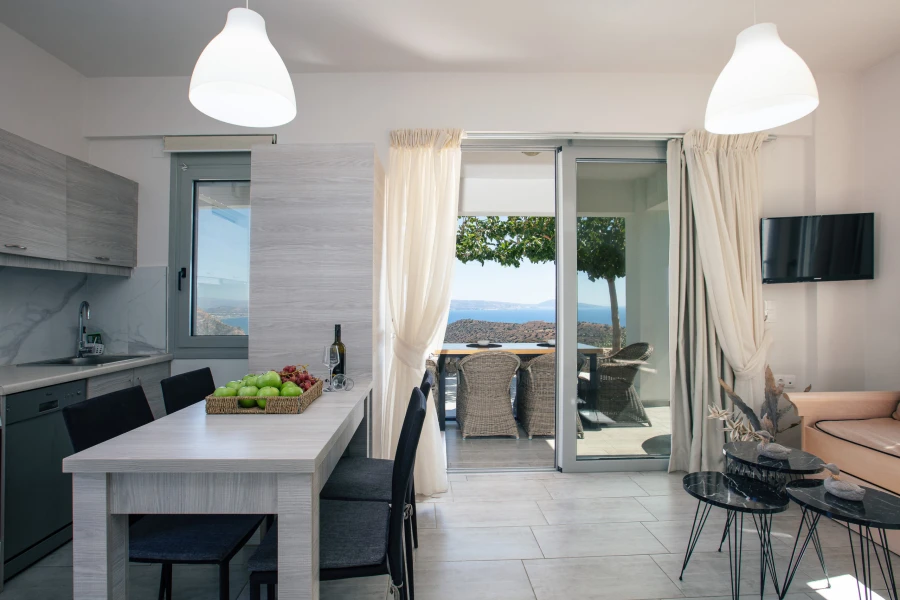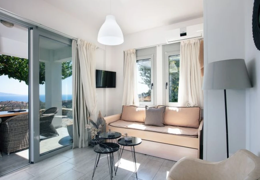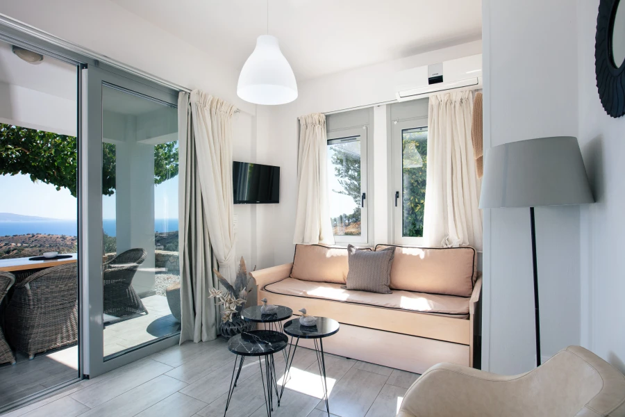 Outside, the private swimming pool invites you to unwind under the Cretan sun, while the shaded veranda offers a peaceful spot to enjoy al fresco meals or sunset drinks—all with uninterrupted sea views. Generous outdoor areas provide the perfect setting for relaxation, whether you’re reading a book, sunbathing, or simply soaking in the tranquility of the landscape.