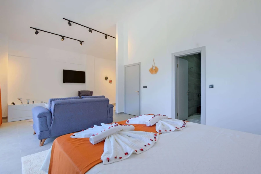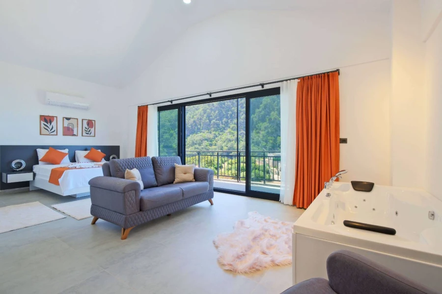 Located in the Kirme area of Faralya, approximately 15 km from Ölüdeniz, this stunning villa offers accommodation for up to 4 guests and features a private jacuzzi. With its breathtaking sea views, tranquil natural surroundings, and carefully selected furnishings, it promises an unforgettable holiday experience. Villa has a capacity for 4 Guests: Ideal for a relaxing getaway with family or friends, featuring two spacious and comfortable bedrooms.