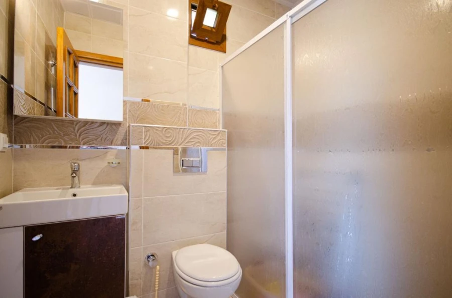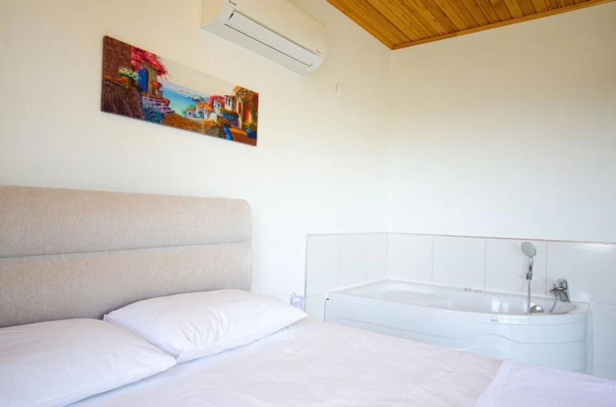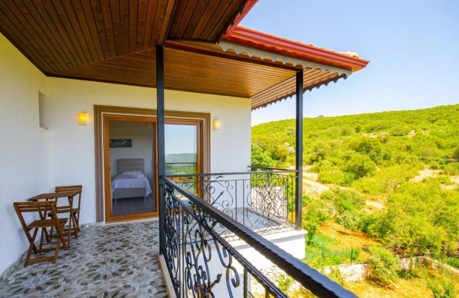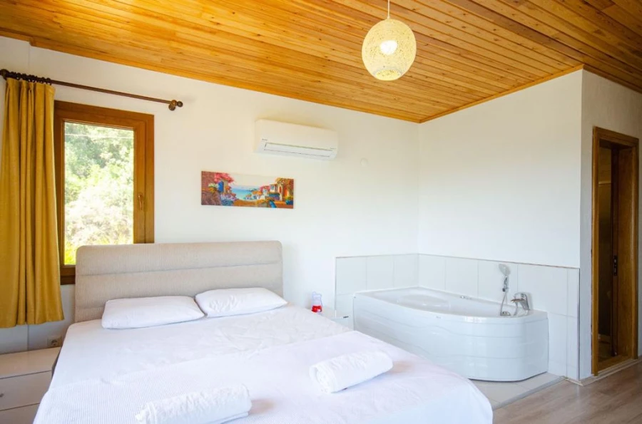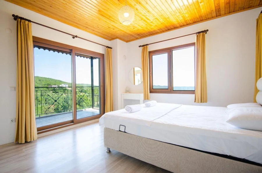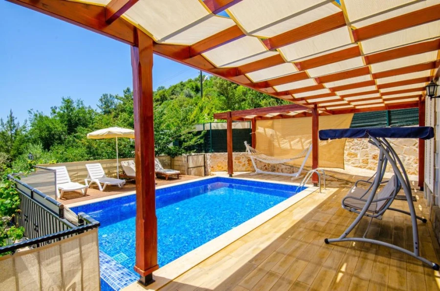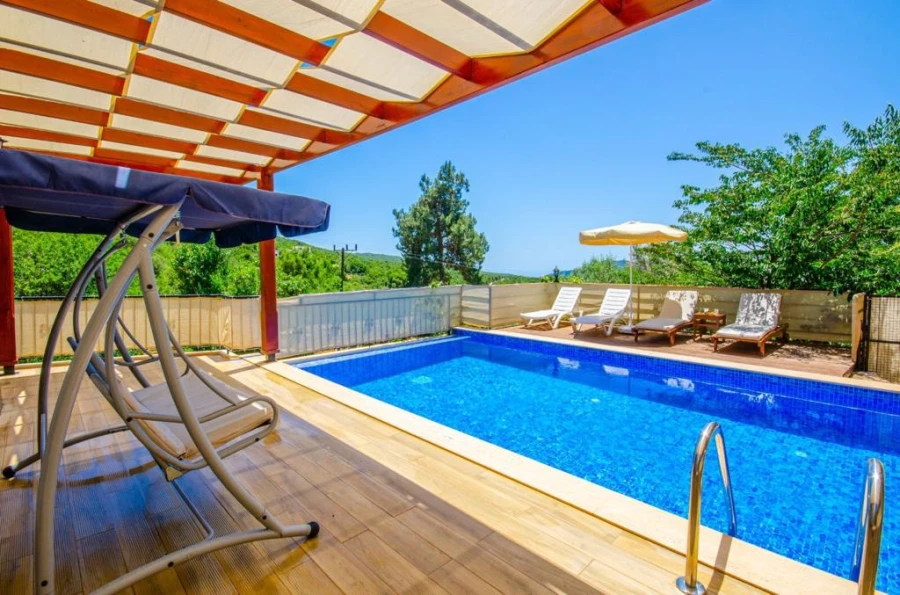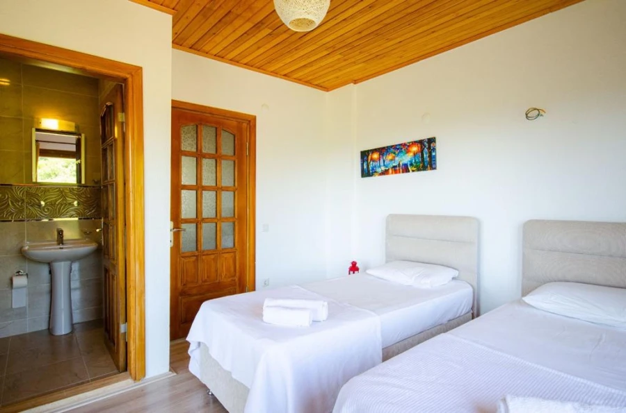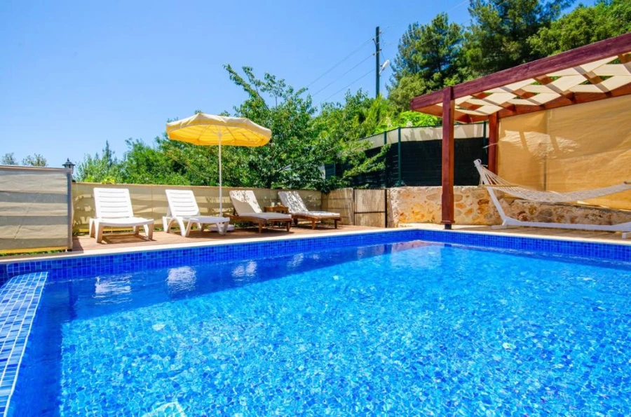 This secluded villa in Kaş Çukurbağ offers a peaceful retreat surrounded by lush greenery. Set within a spacious kiwi garden, the villa provides a relaxing atmosphere for those seeking privacy and tranquility. With its thoughtfully designed interior and natural surroundings, it is an ideal choice for honeymoon couples and small families.