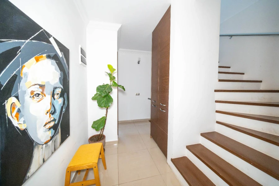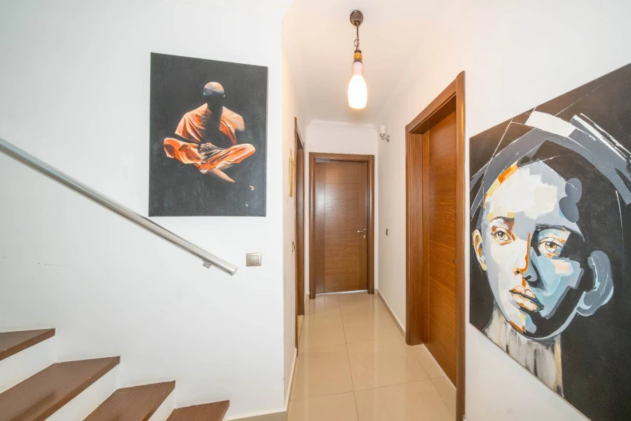 The villa is a duplex with a maximum capacity of 10 guests. It has five bedrooms. The ground floor includes a living room, a kitchen, a shared bathroom, a TV, air conditioning, and three bedrooms. The second floor features two more bedrooms and another shared bathroom.