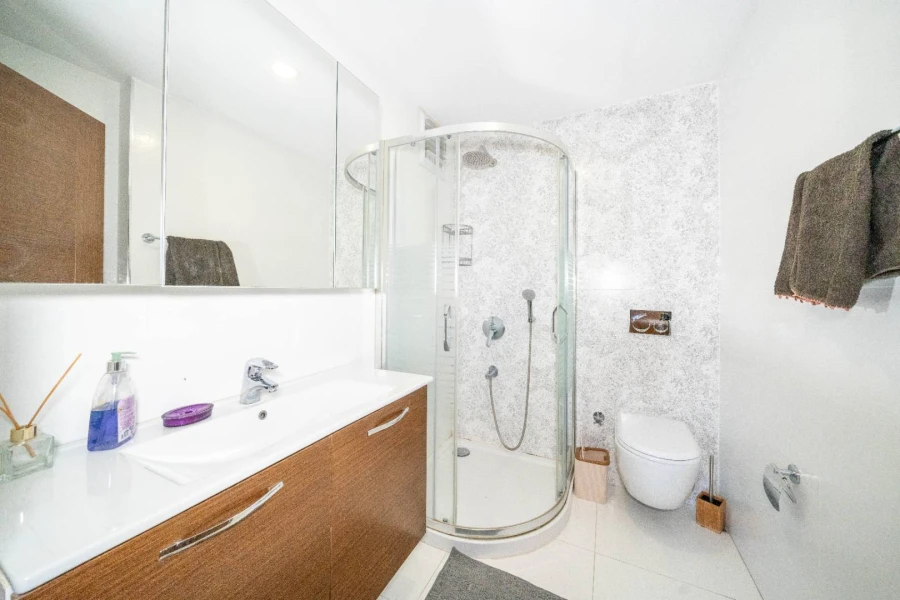 The first bedroom on the ground floor has a double bed, an en-suite bathroom, and air conditioning.