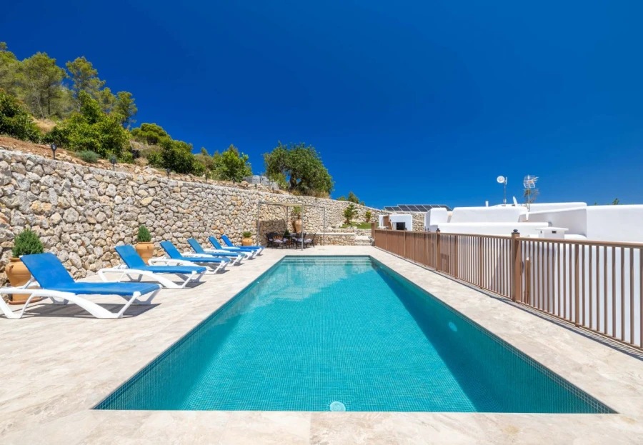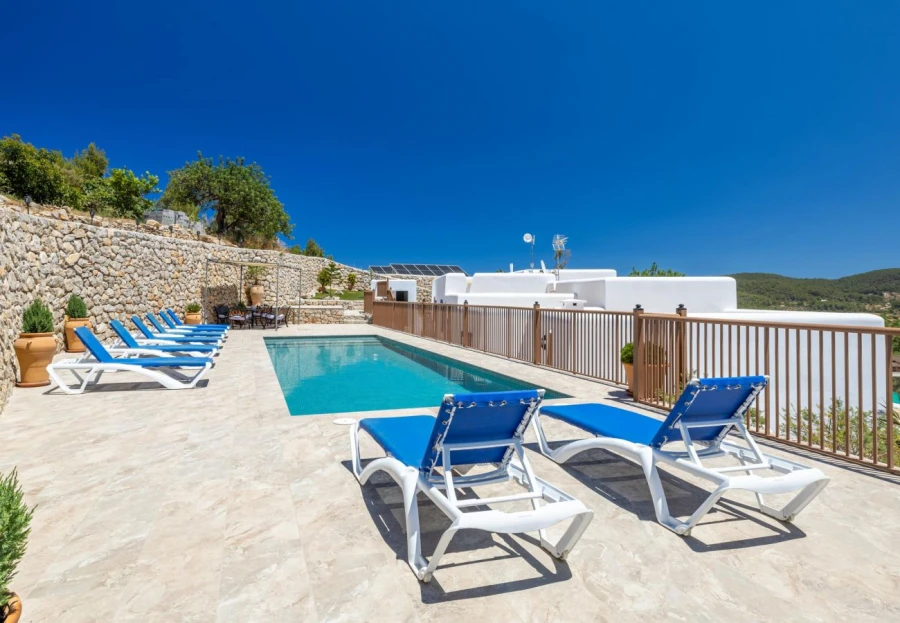 Outside, expansive terraces reveal serene countryside views, while the private pool area invites you to lounge under the sun or enjoy a sunset in the chill-out zone.
