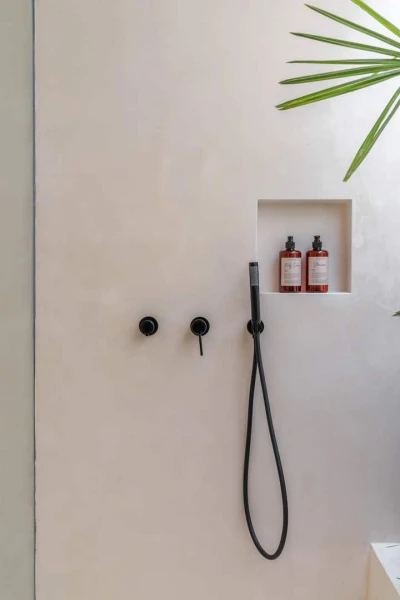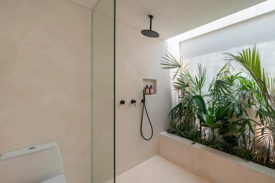 The bathroom is a soothing space with a well-designed shower room to refresh after a day of exploration.