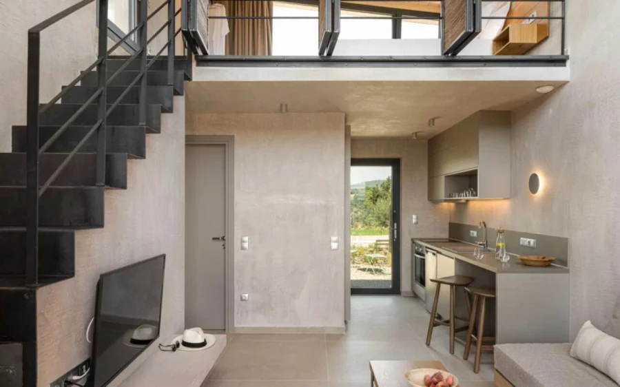 Nestled in the charming town of Nikiti, this stylish villa offers an intimate retreat for up to 3 guests. Our villa features a private pool, a queen-size bed on the loft level, and a comfortable sofa bed in the open-plan living area below. Designed to blend seamlessly with nature, the interiors provide panoramic views of the forest and sea, creating a serene and immersive experience.