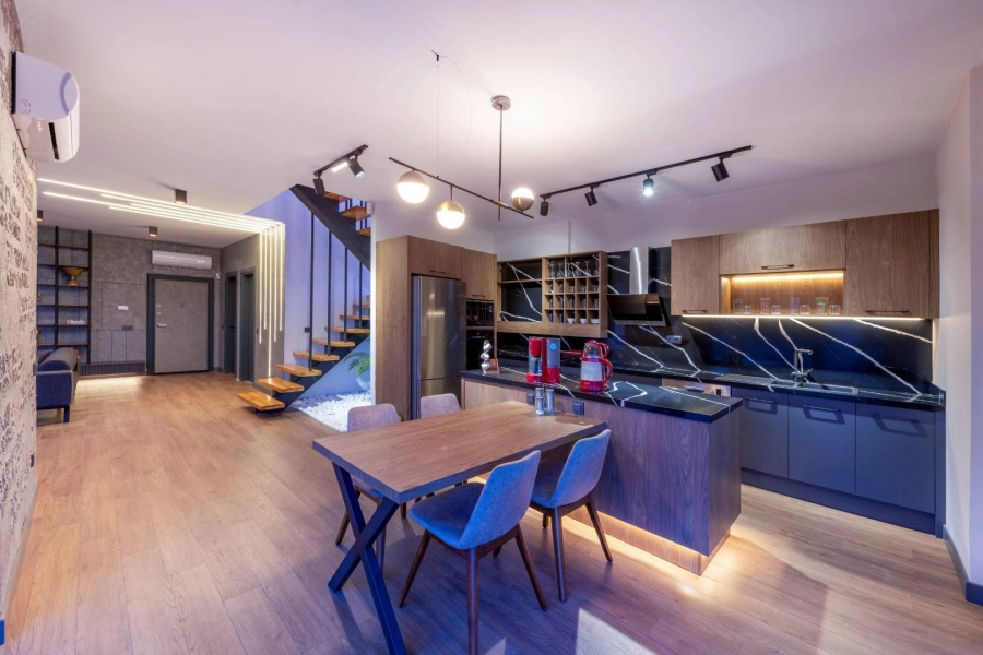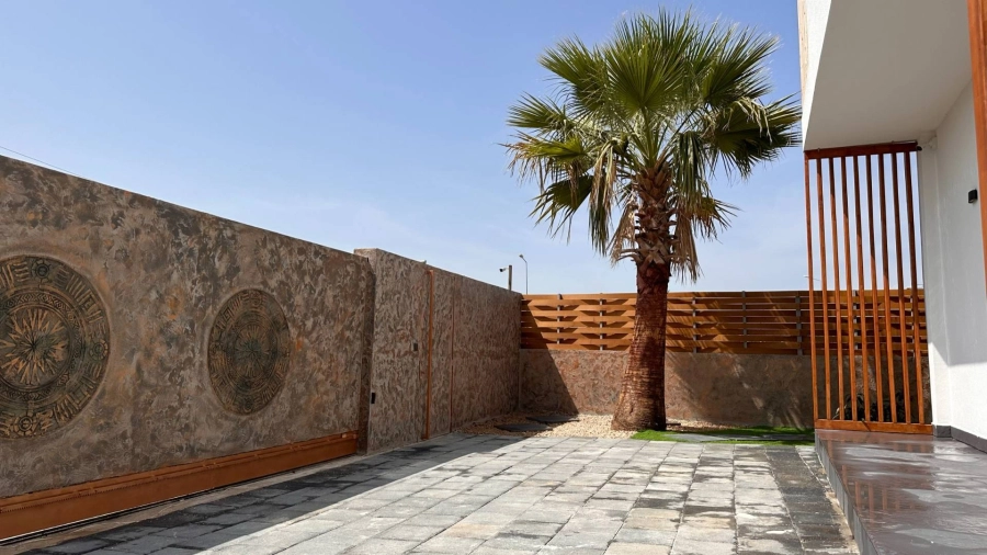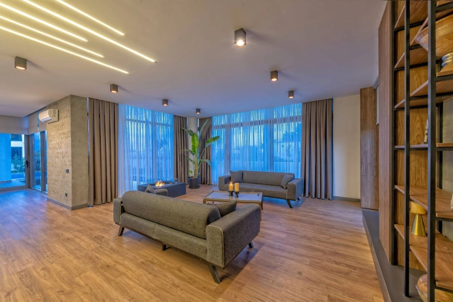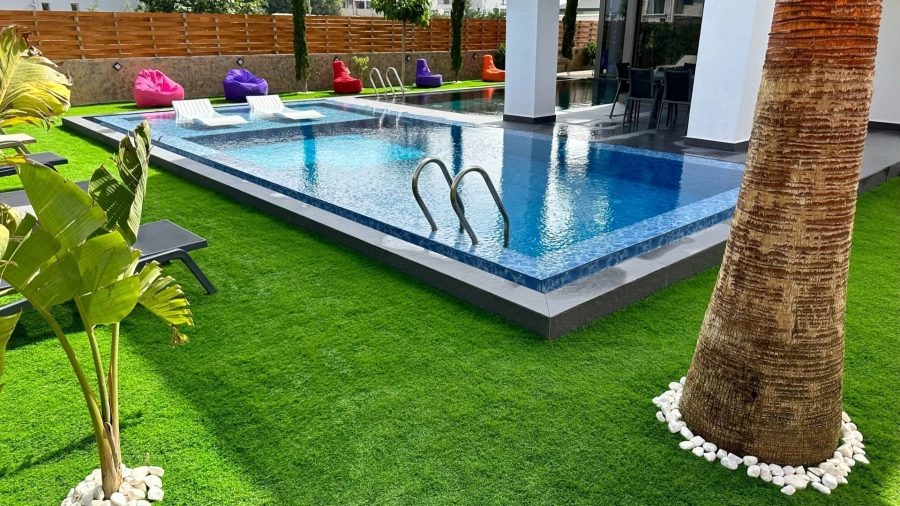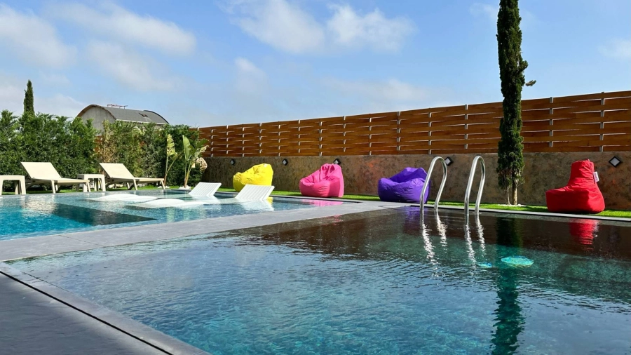 The interiors are decorated with modern furniture, creating a bright and spacious atmosphere. The villa includes 3 bedrooms, 3 bathrooms, a large living room, and a fully equipped kitchen. With these features, it can comfortably accommodate a family or group of friends of up to 8 people.