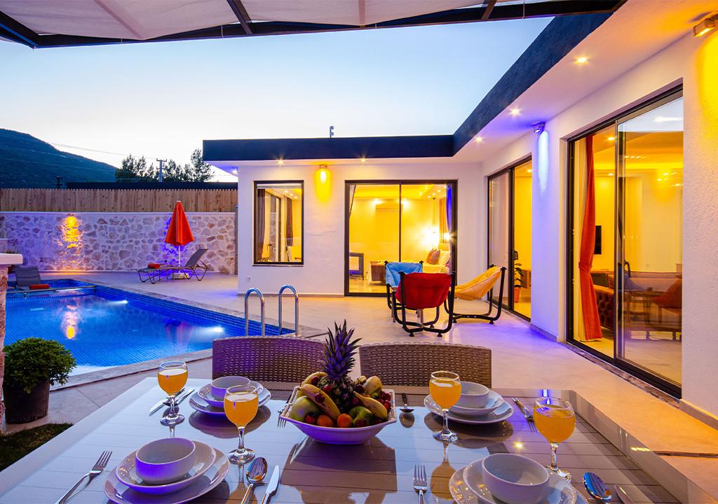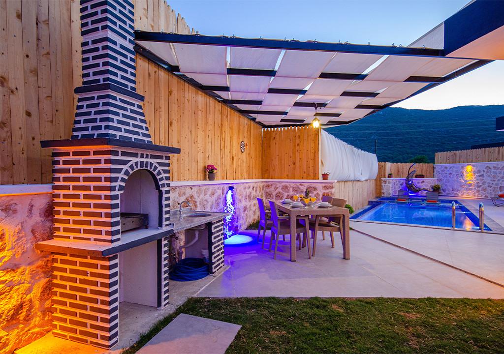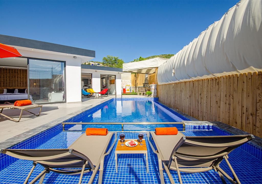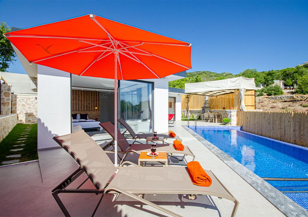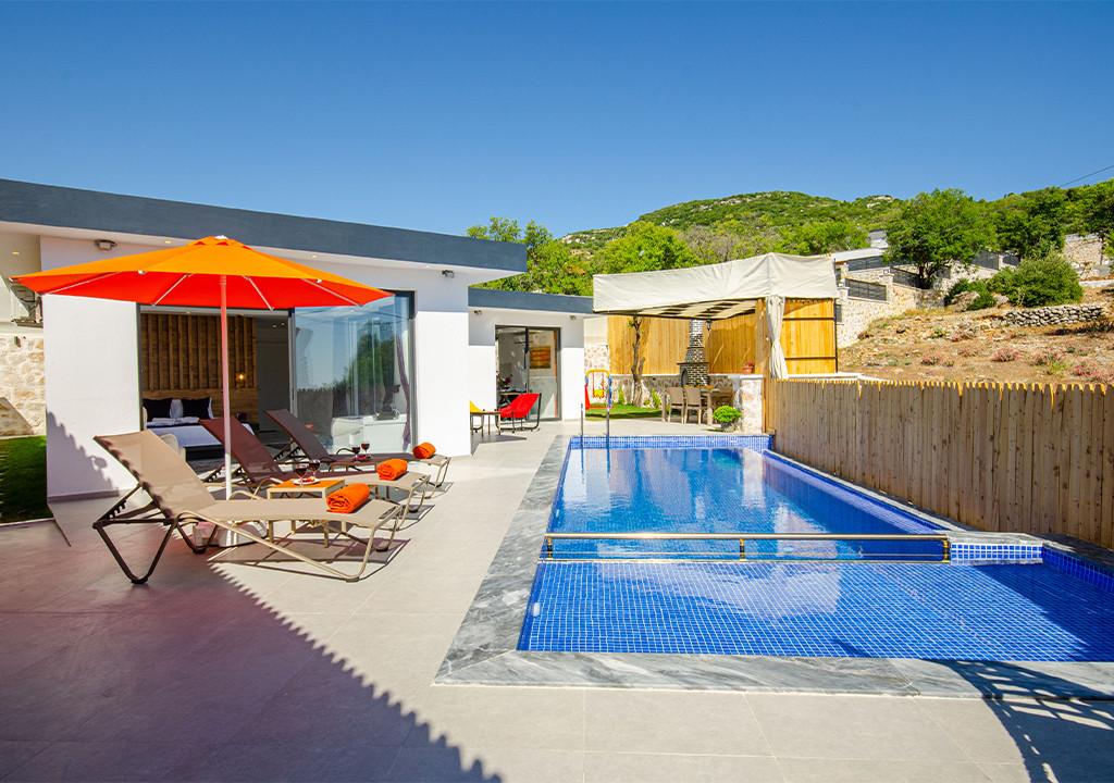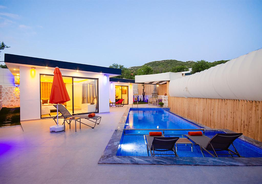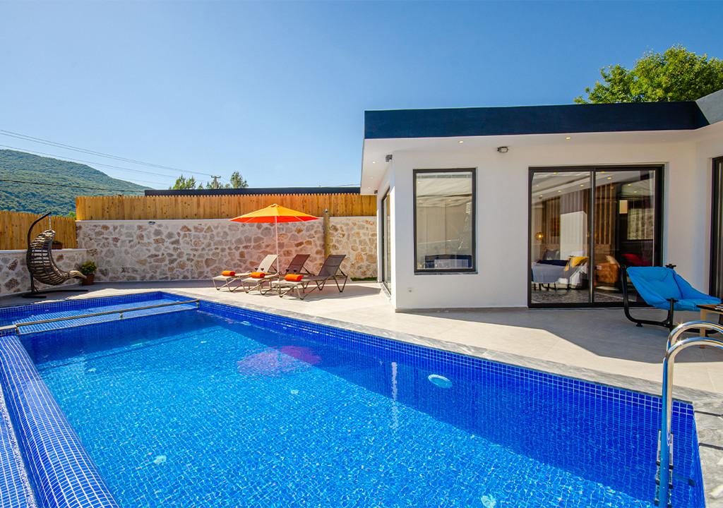 Villa, located in the village of Sarıbelen in Kalkan, is a 1-bedroom villa nestled amidst nature. The pool area, unseen from the outside, makes Villa a suitable choice for conservative families. Our villa, ideal for honeymoon couples, offers you the opportunity to have an unforgettable holiday.