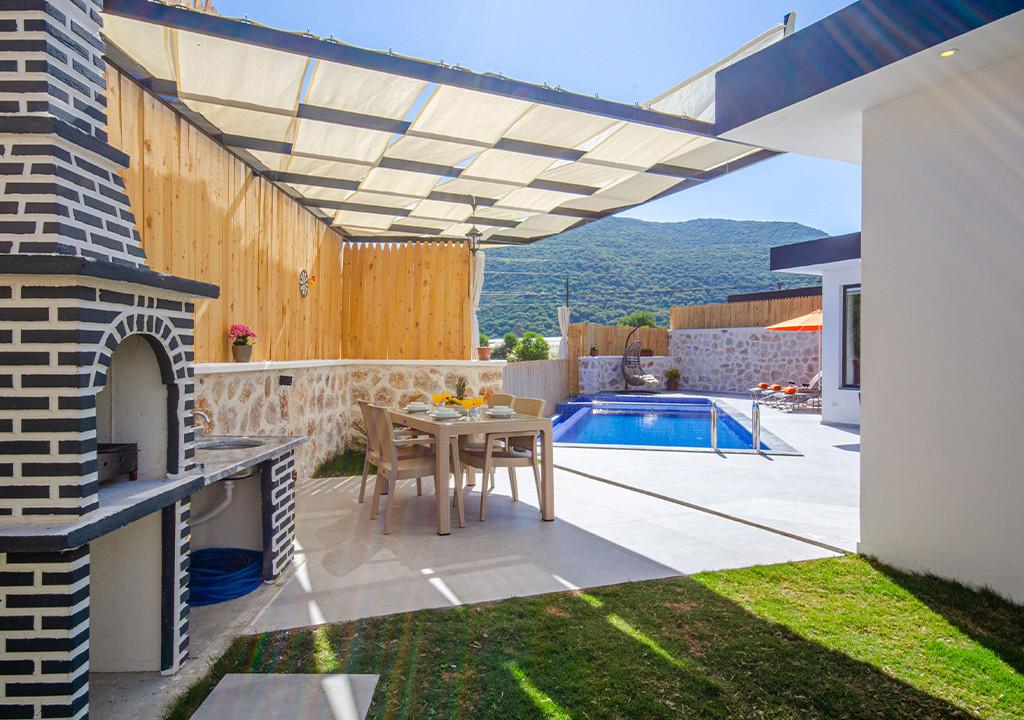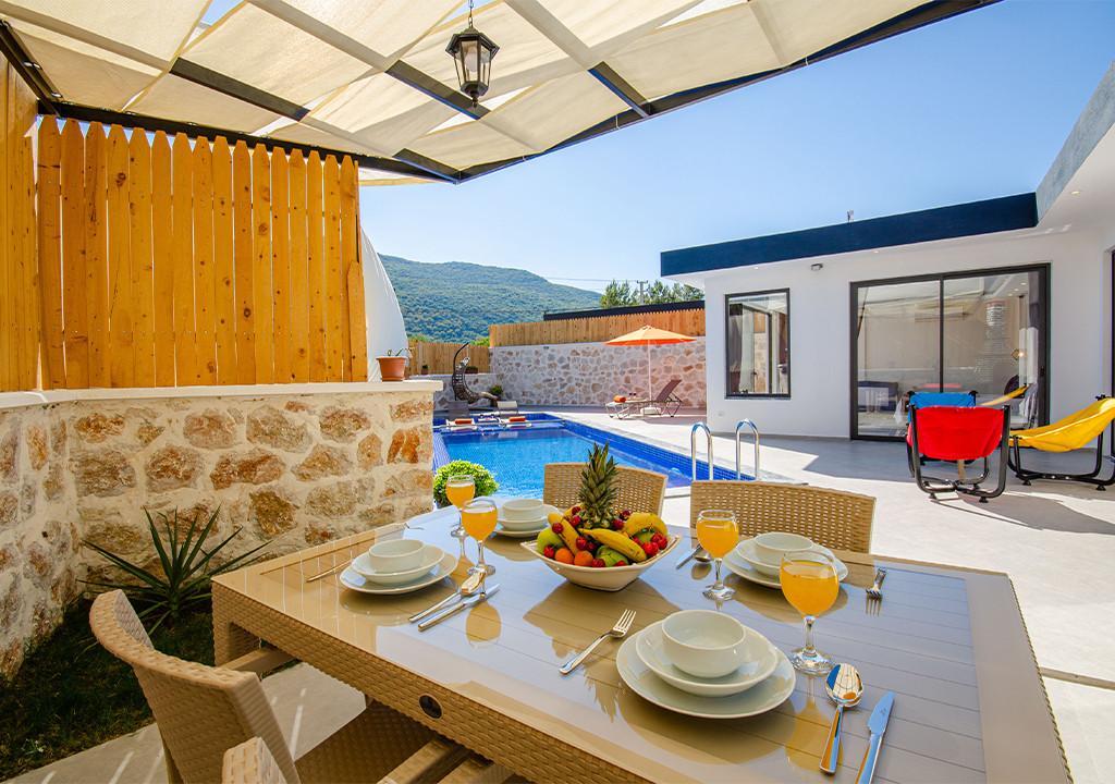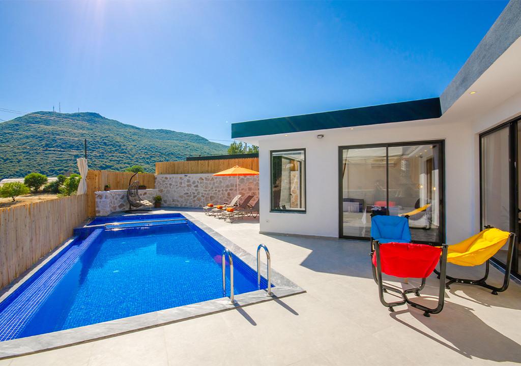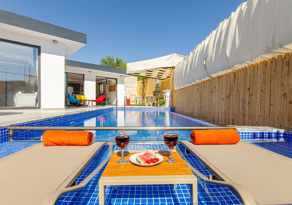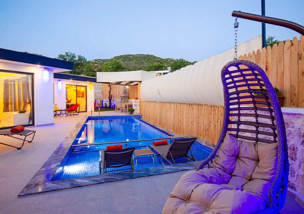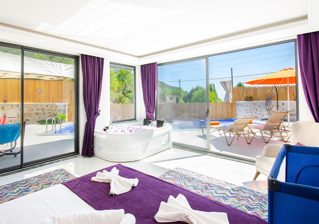 Villa, located in the village of Sarıbelen in Kalkan, is a 1-bedroom villa nestled amidst nature. The pool area, unseen from the outside, makes Villa a suitable choice for conservative families. Our villa, ideal for honeymoon couples, offers you the opportunity to have an unforgettable holiday.