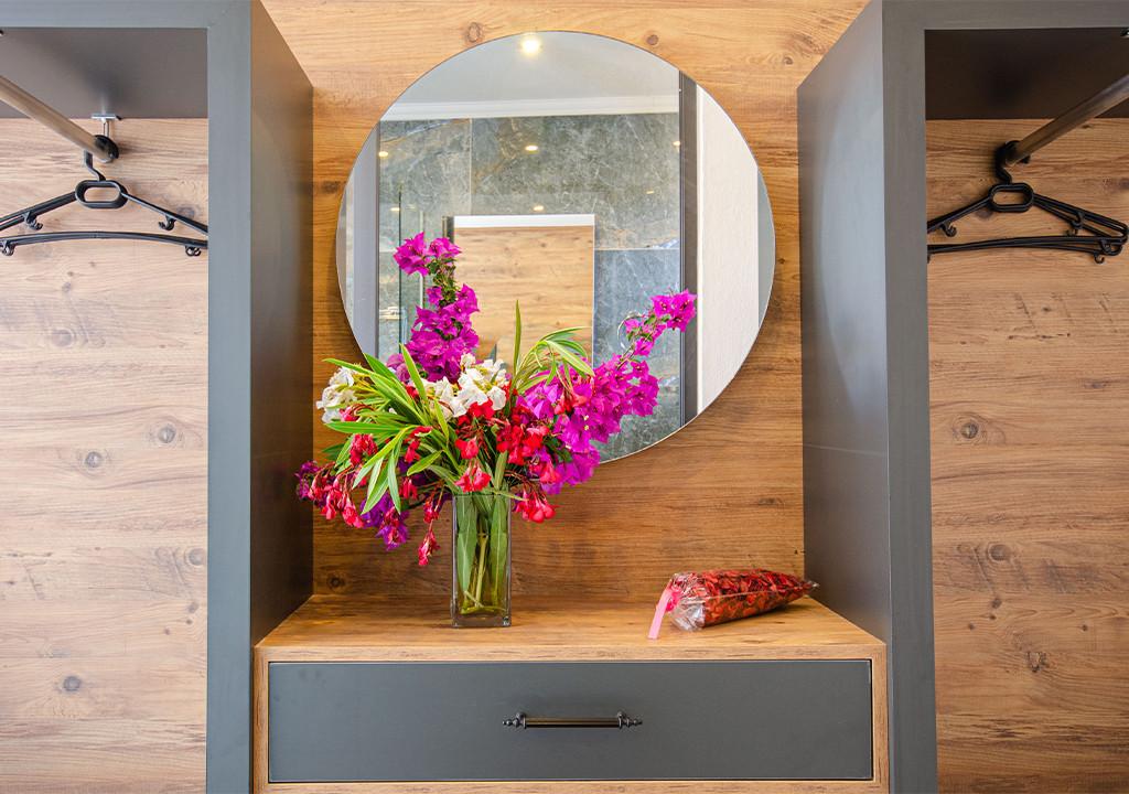 Double bed, Vanity table, Bedside table, Air conditioning, Wardrobe, Bathroom and toilet.