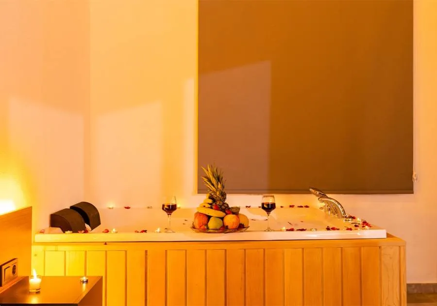 Double bed, air conditioning, bedside table, wardrobe, Jacuzzi bath, and sink.
