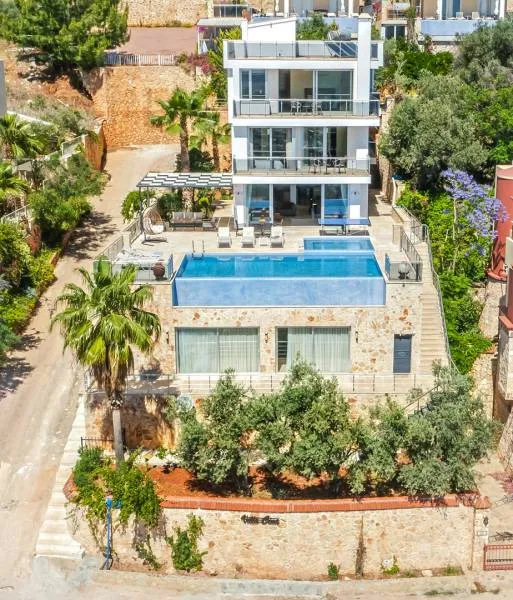 This villa, with breathtaking sea views, is located approximately 1.3 km from Kalkan Public Beach. Every room offers stunning views of the sea and spectacular sunsets. The luxurious villa features a private pool, expansive garden, barbecue facilities, free WiFi, and private parking.
