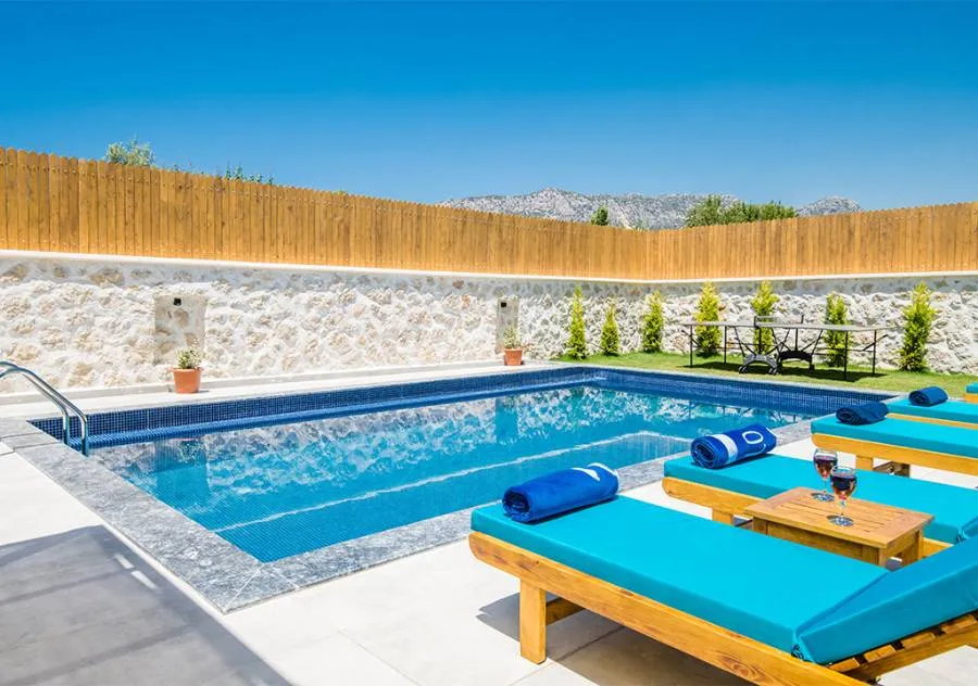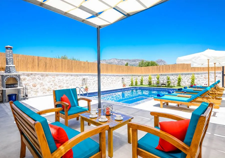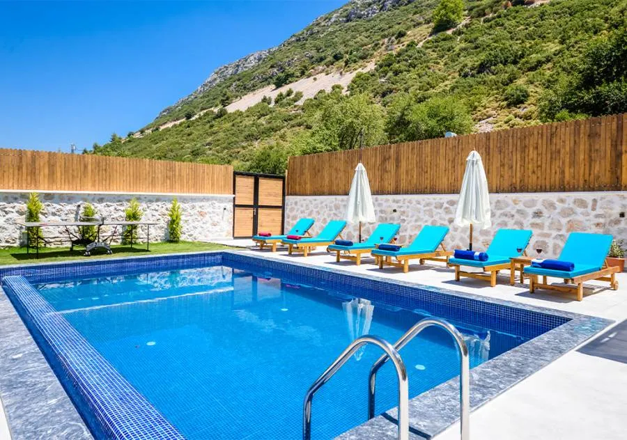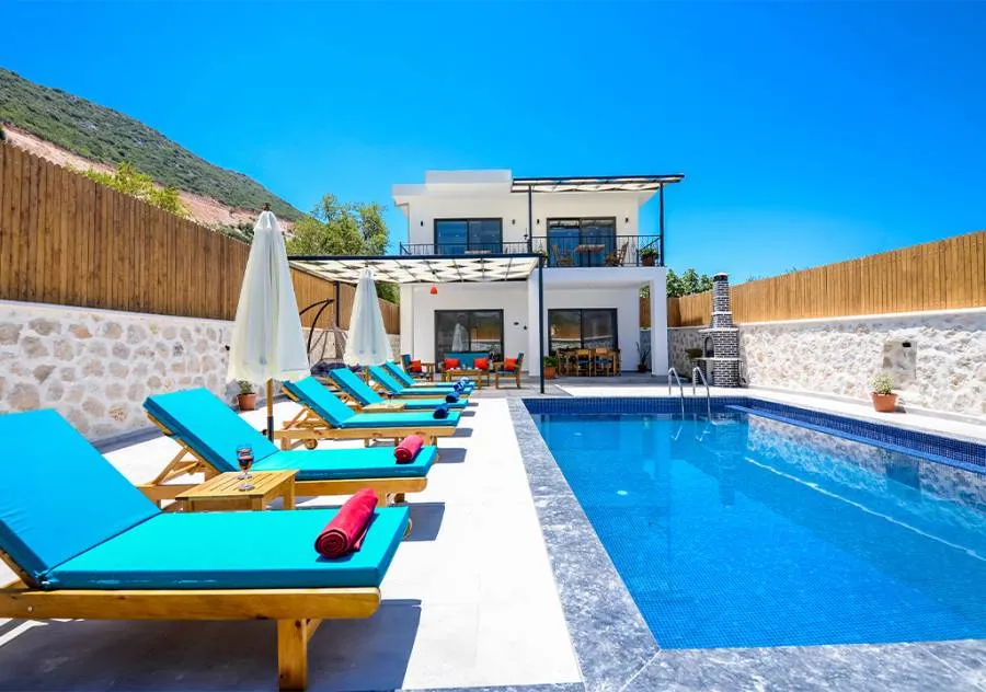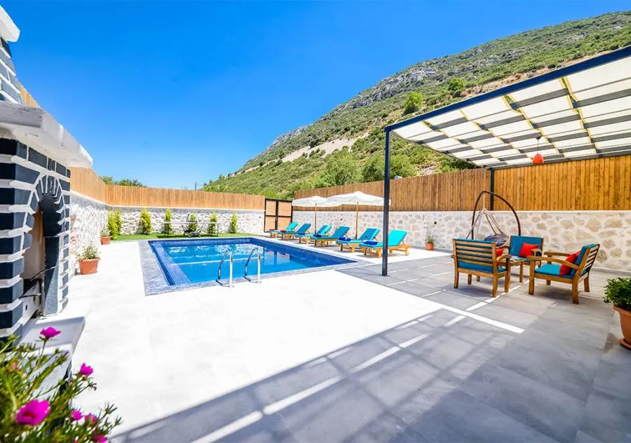 Villa is a 3-bedroom villa located in the village of Bezirgan in Kalkan. The pool area of Villa is not visible from the outside, making it one of the most suitable choices for conservative families.