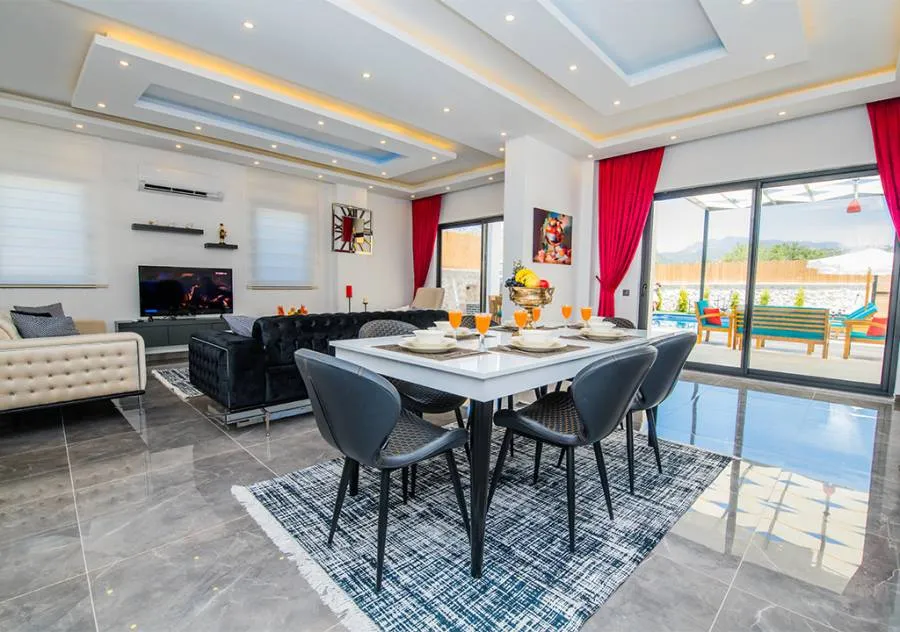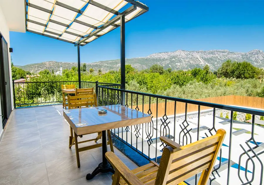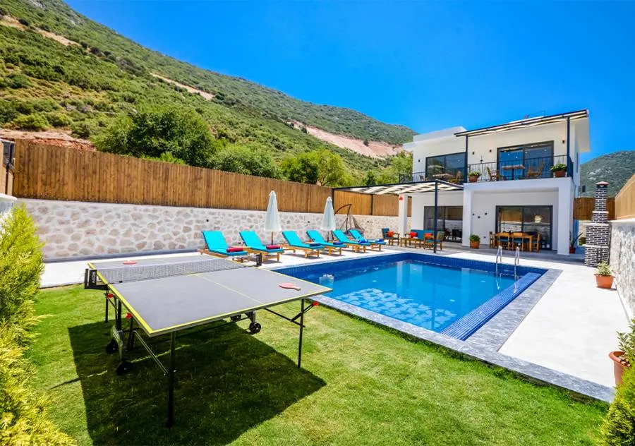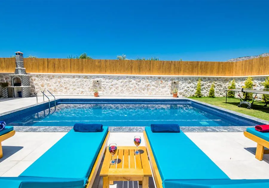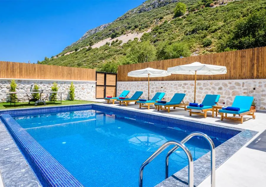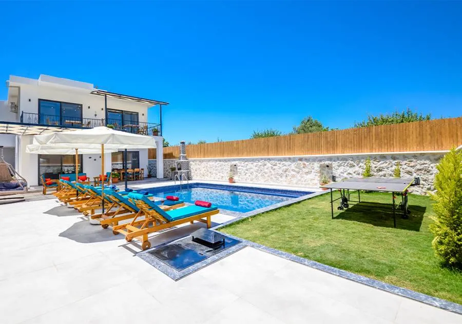 Villa is a 3-bedroom villa located in the village of Bezirgan in Kalkan. The pool area of Villa is not visible from the outside, making it one of the most suitable choices for conservative families.