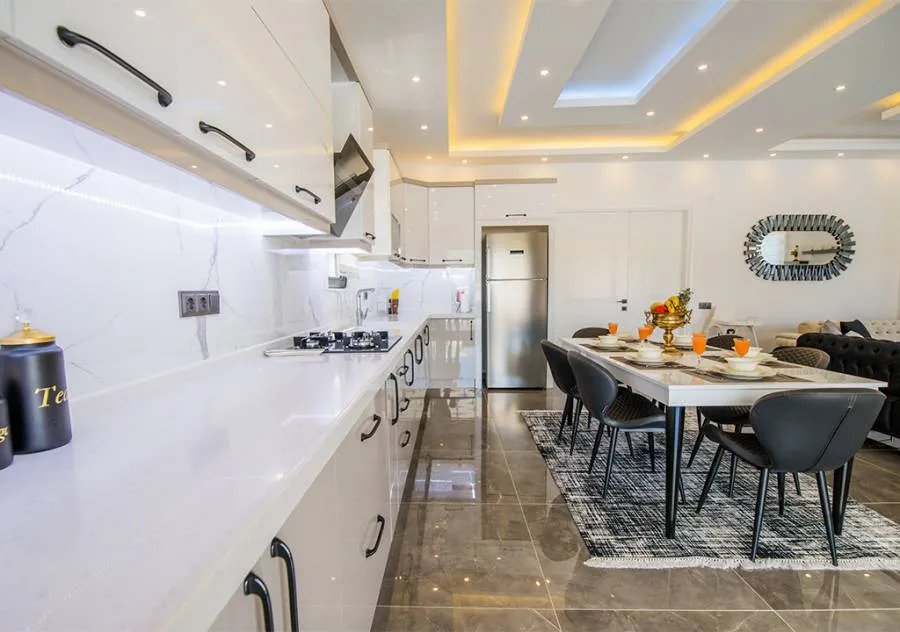 Refrigerator, Dishwasher, Oven with 4-burner stove (built-in), Microwave oven, Electric kettle, water dispenser, 6-person dining set, Pan, Pots, Cutlery, etc.