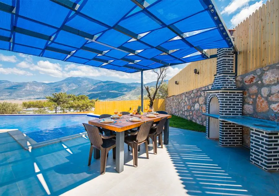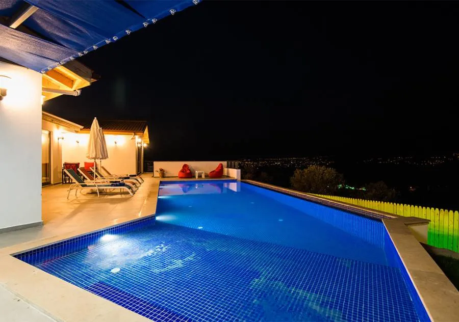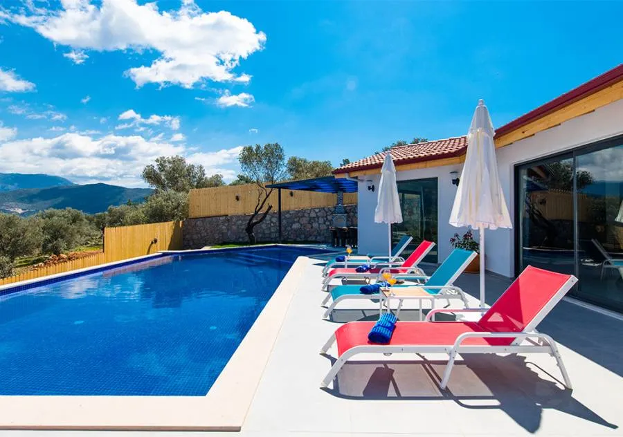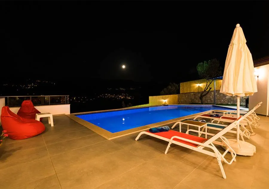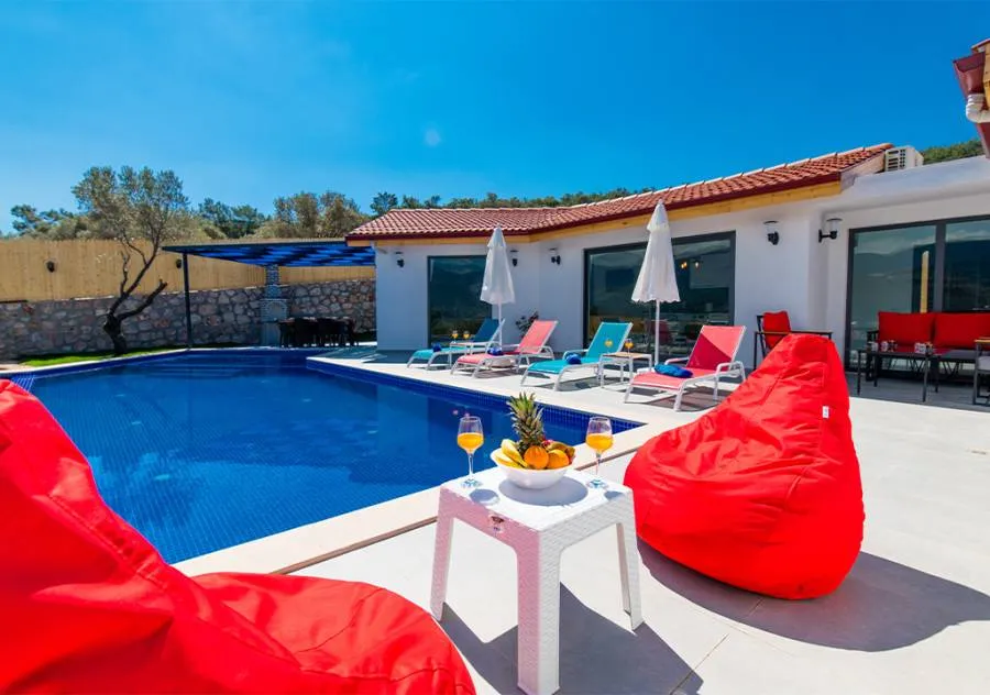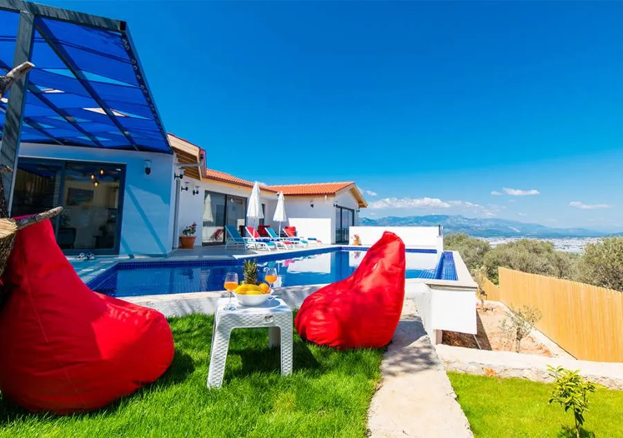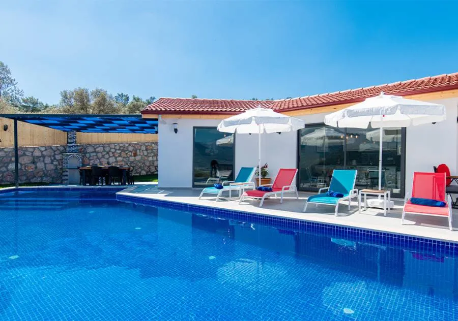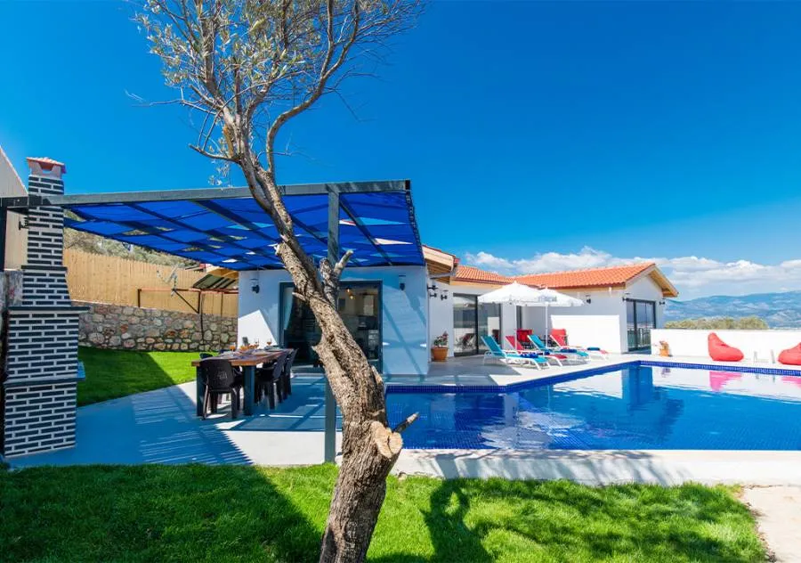 Villa, located in the Yeşilköy area of Kalkan, is a villa with 2 bedrooms and a capacity for 4 people. Situated amidst nature, the pool and garden area of our villa are not visible from the outside, making it a suitable choice for conservative guests and honeymoon couples.