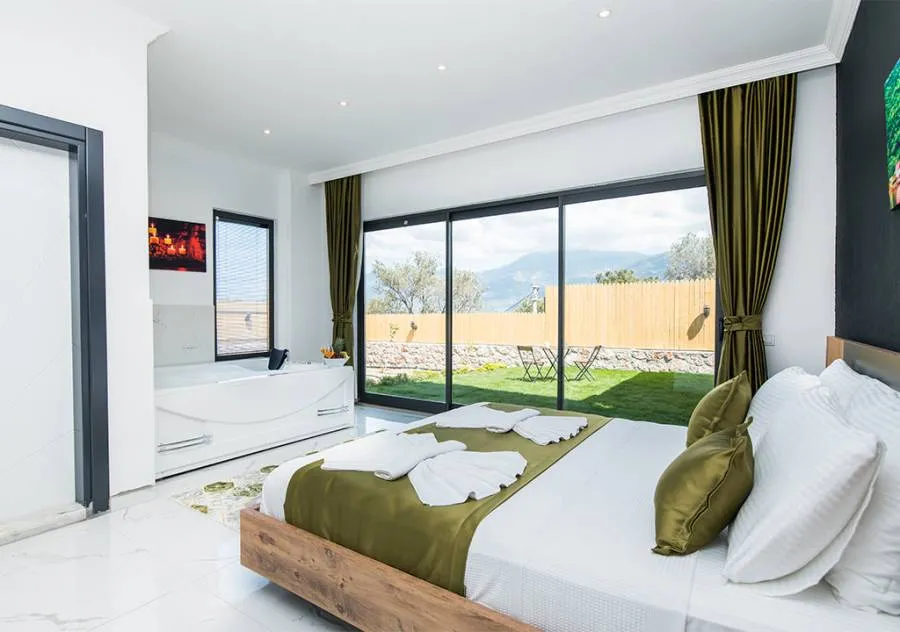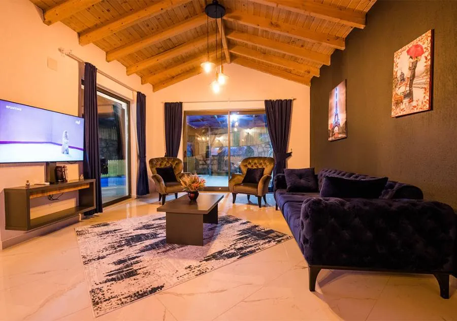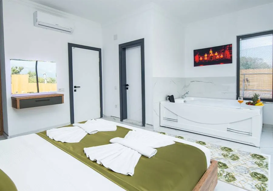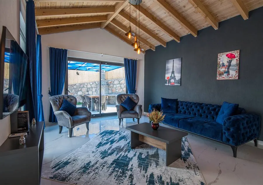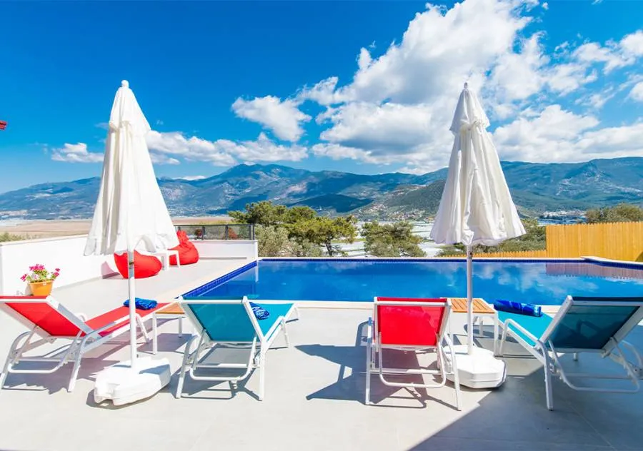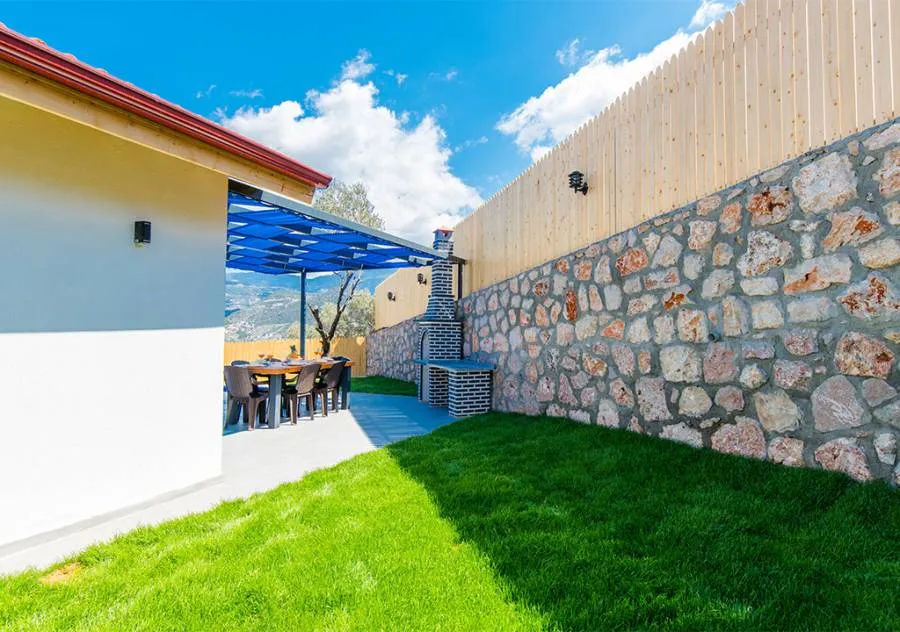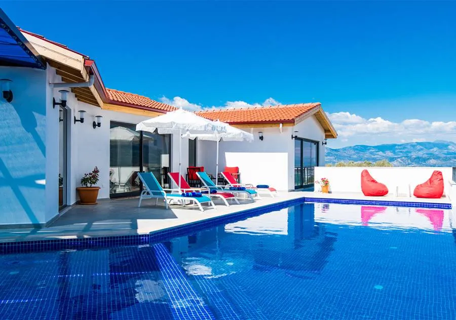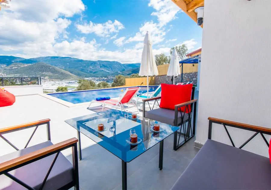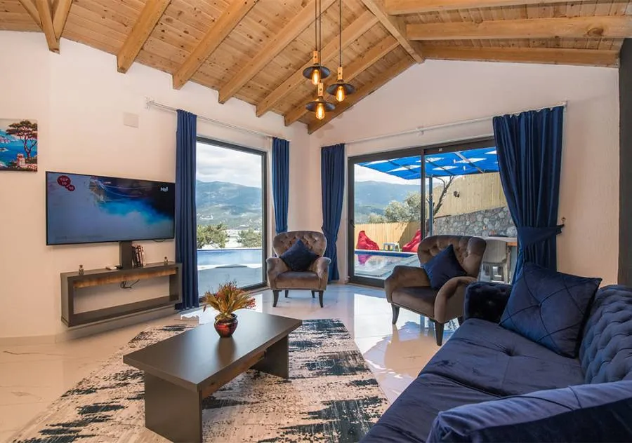 Villa, located in the Yeşilköy area of Kalkan, is a villa with 2 bedrooms and a capacity for 4 people. Situated amidst nature, the pool and garden area of our villa are not visible from the outside, making it a suitable choice for conservative guests and honeymoon couples.