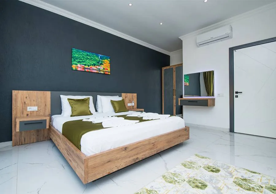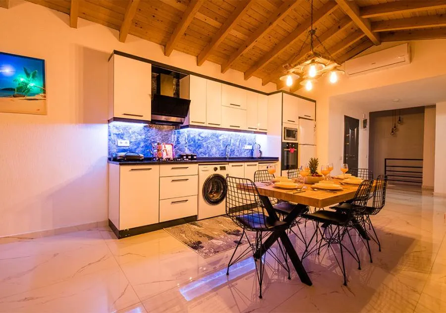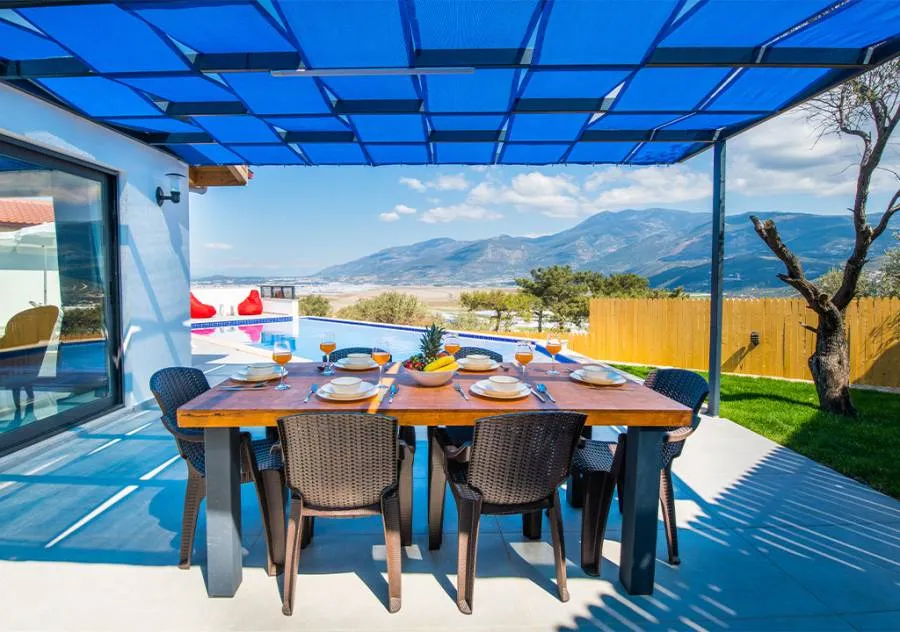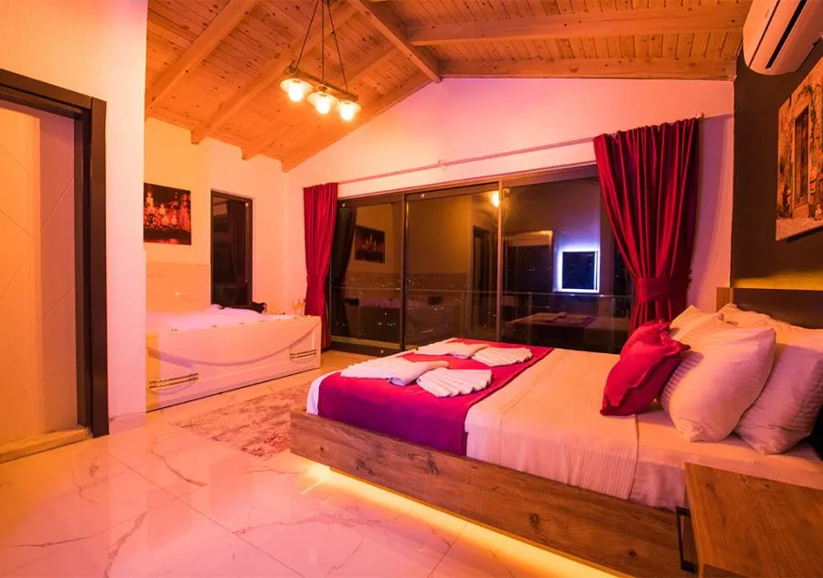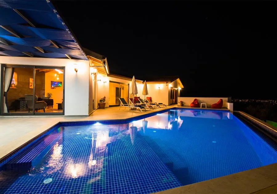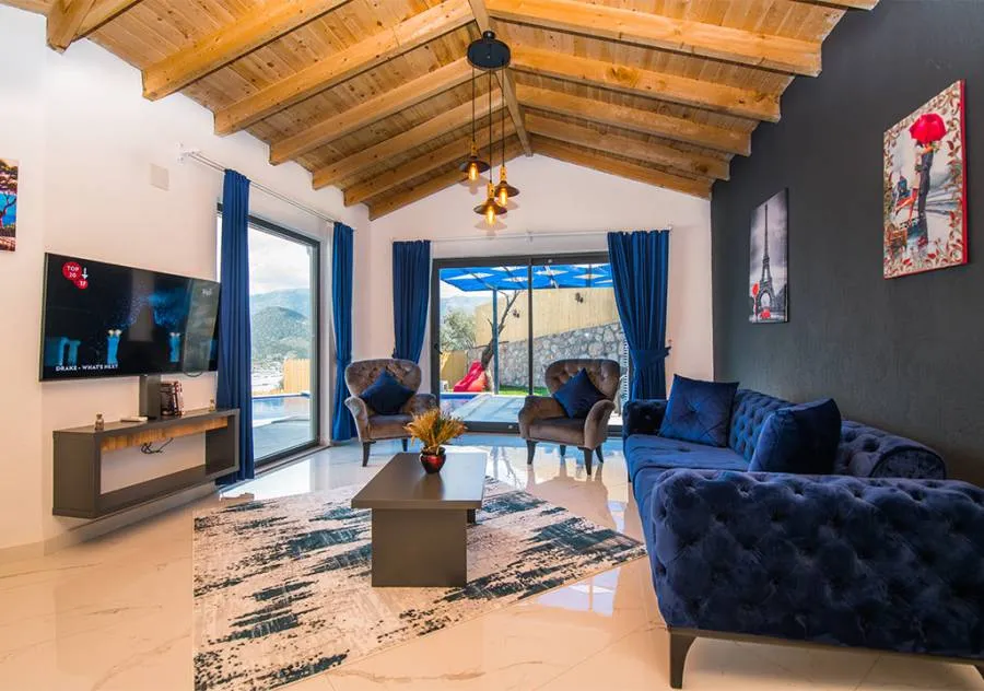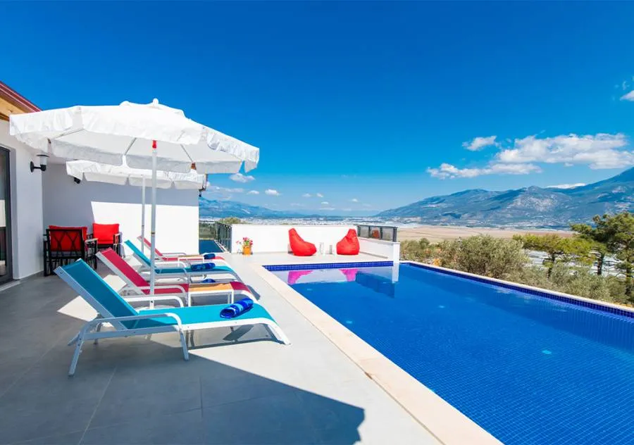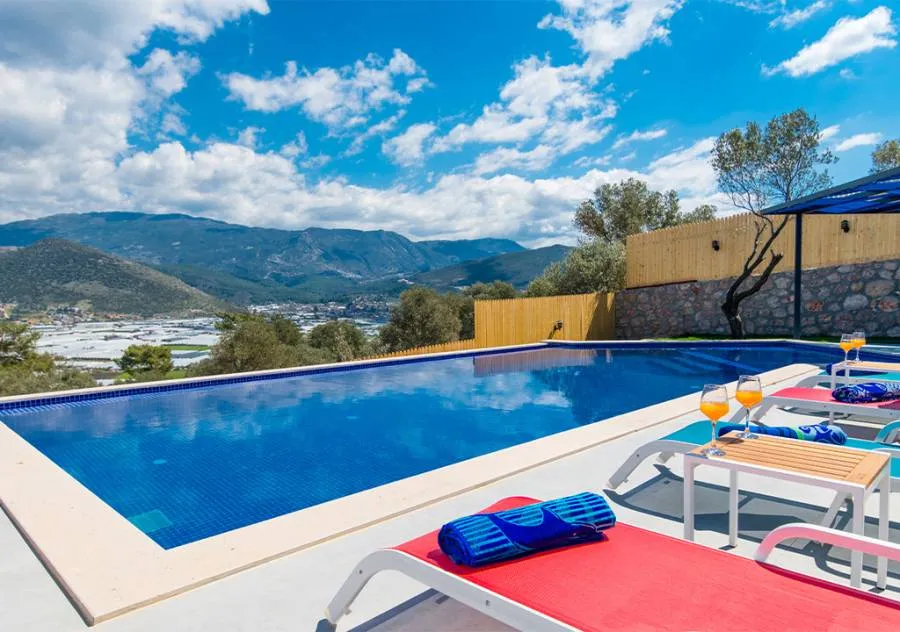 Villa, located in the Yeşilköy area of Kalkan, is a villa with 2 bedrooms and a capacity for 4 people. Situated amidst nature, the pool and garden area of our villa are not visible from the outside, making it a suitable choice for conservative guests and honeymoon couples.